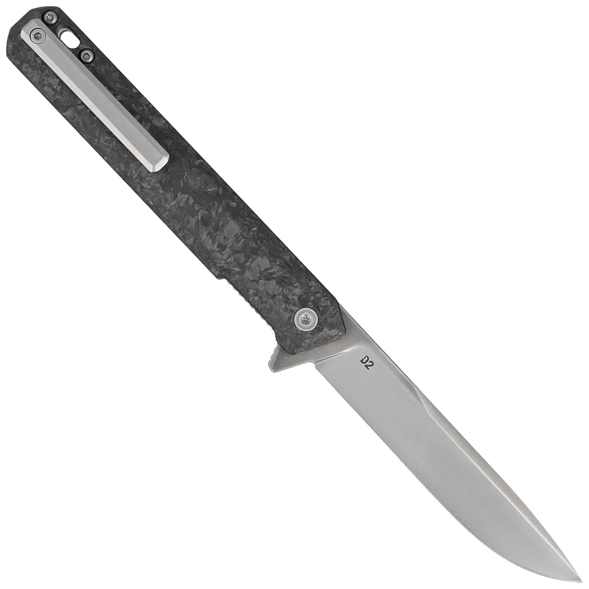 - F2 Bravo Black Forged Carbon Fiber, Silver HW/Clip, Satin compact folding knife from Tekto Knives. Utilitarian blade made of D2 tool steel, solid Carbon Fiber composite grips. Lightweight and durable, you can carry it comfortably in the included pouch.