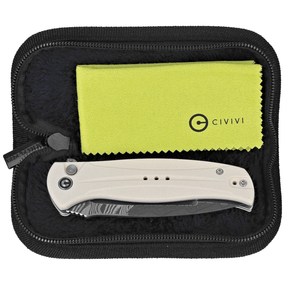 Incindie Ivory G10, Damascus large all-purpose folding knife designed for easy carrying that meets all the utility requirements of an E.D.C. knife . Stainless damascus spear point blade. Intuitive Button Lock and ergonomic G10 composite handle with deep carry clip. Design made with the highest quality by Civivi.