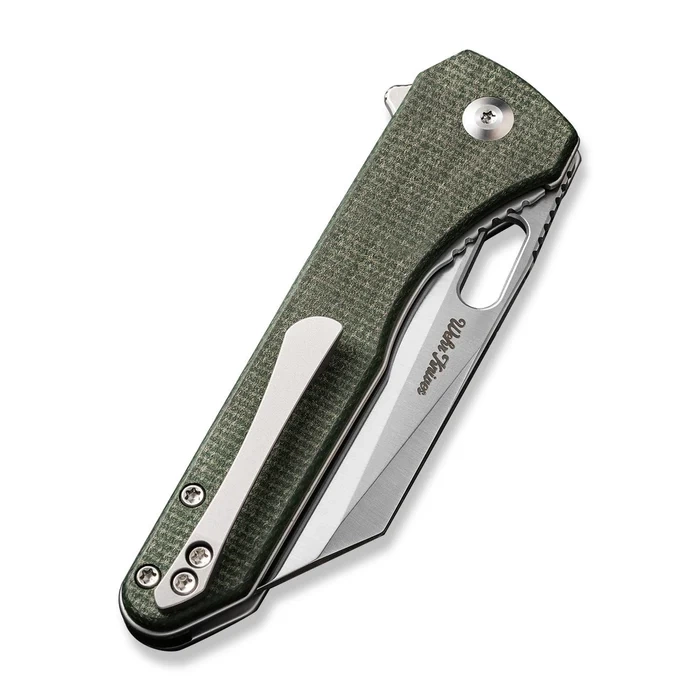 Nugz Green Canvas Micarta, Satin excellent EDC folding knife. Blade made of Sandvik 14C28N stainless steel, Handle grips made of Canvas Micarta composite. Wedge hole or quick Flipper flipper for opening. Designed by American knifemaker Matthew Wehrwein for Civivi. The perfect everyday companion. A bestseller!