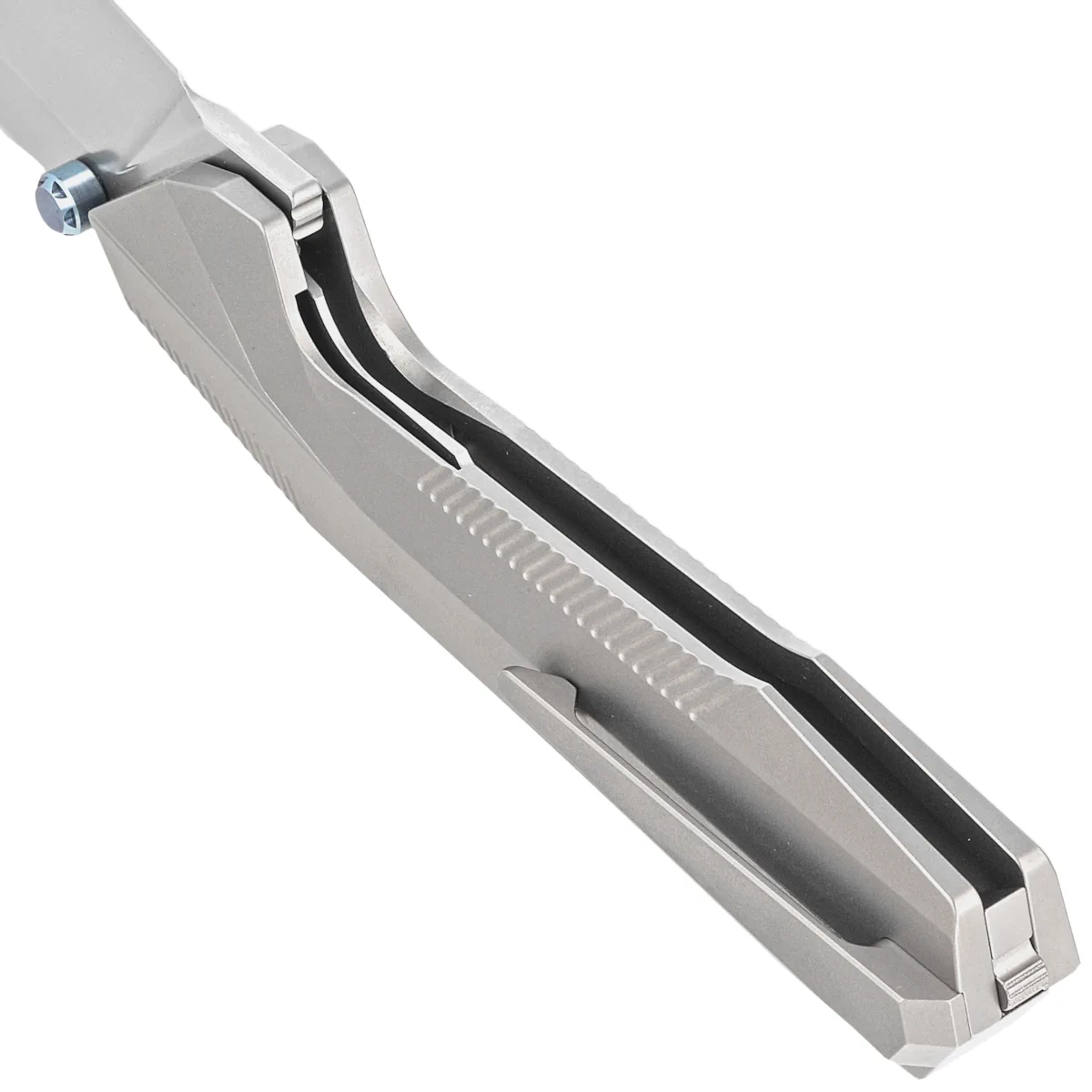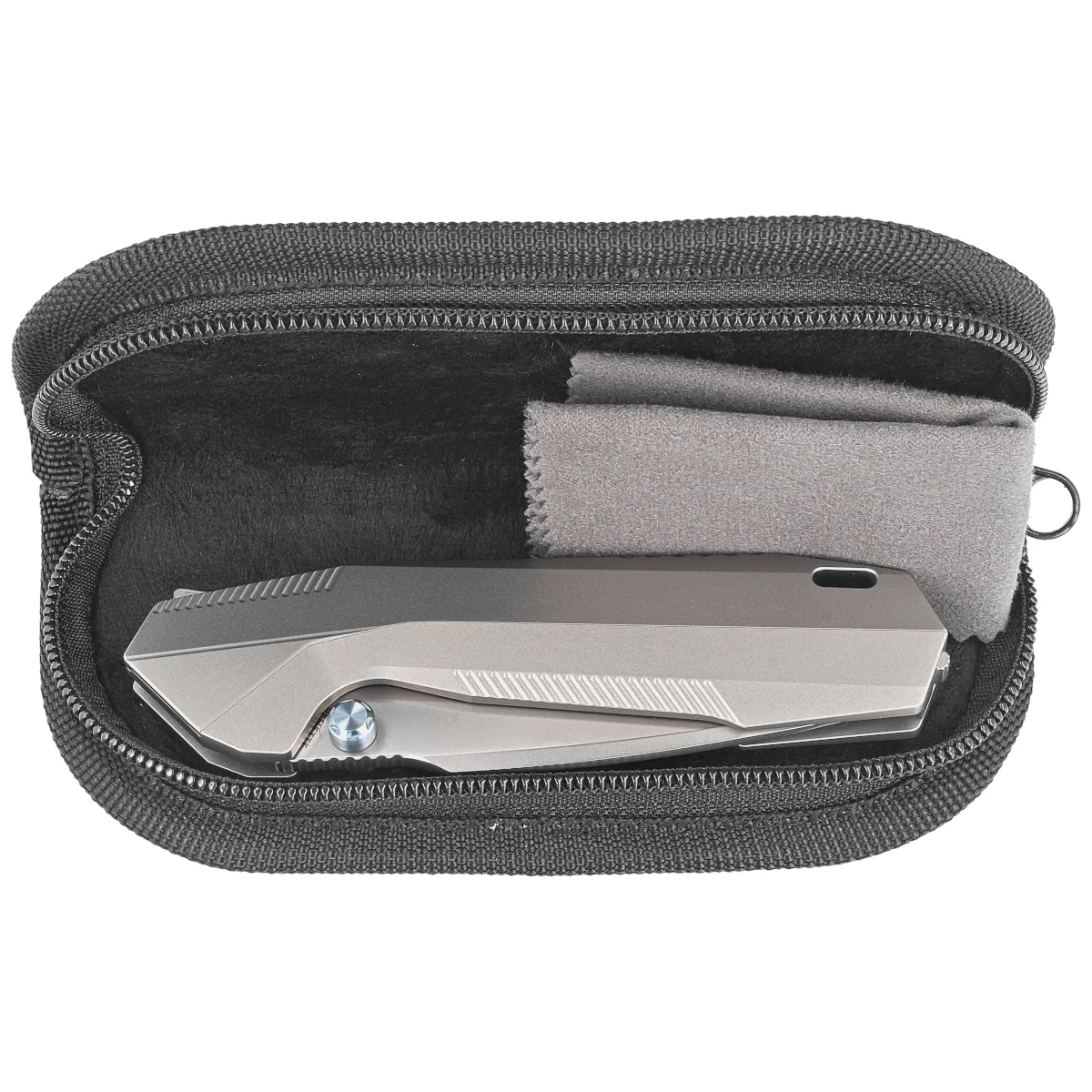 RT-WK1-A Disassemble Knife Gray Titanium, Hand Grinding Pearlescent, a unique EDC folder, a display of engineering in design, combines excellent functionality with unique style. The handle is something that draws the most attention in this knife. It boasts a titanium exoskeleton on which the outer monolithic housing milled from a single piece of titanium is mounted. This design provides extraordinary strength and structural rigidity. The drop point blade is crafted from Böhler M390 steel, widely regarded as one of the best knife steels available. Flipper tab allows for lightning-fast one-handed knife deployment, which is especially useful in situations where every second matters. The folding knife is designed to be easily disassembled without the need for specialized tools. RT-WK1-A Disassemble Knife combines practicality with modern design, making it an ideal choice for blade enthusiasts who value the ability to maintain their knife themselves.