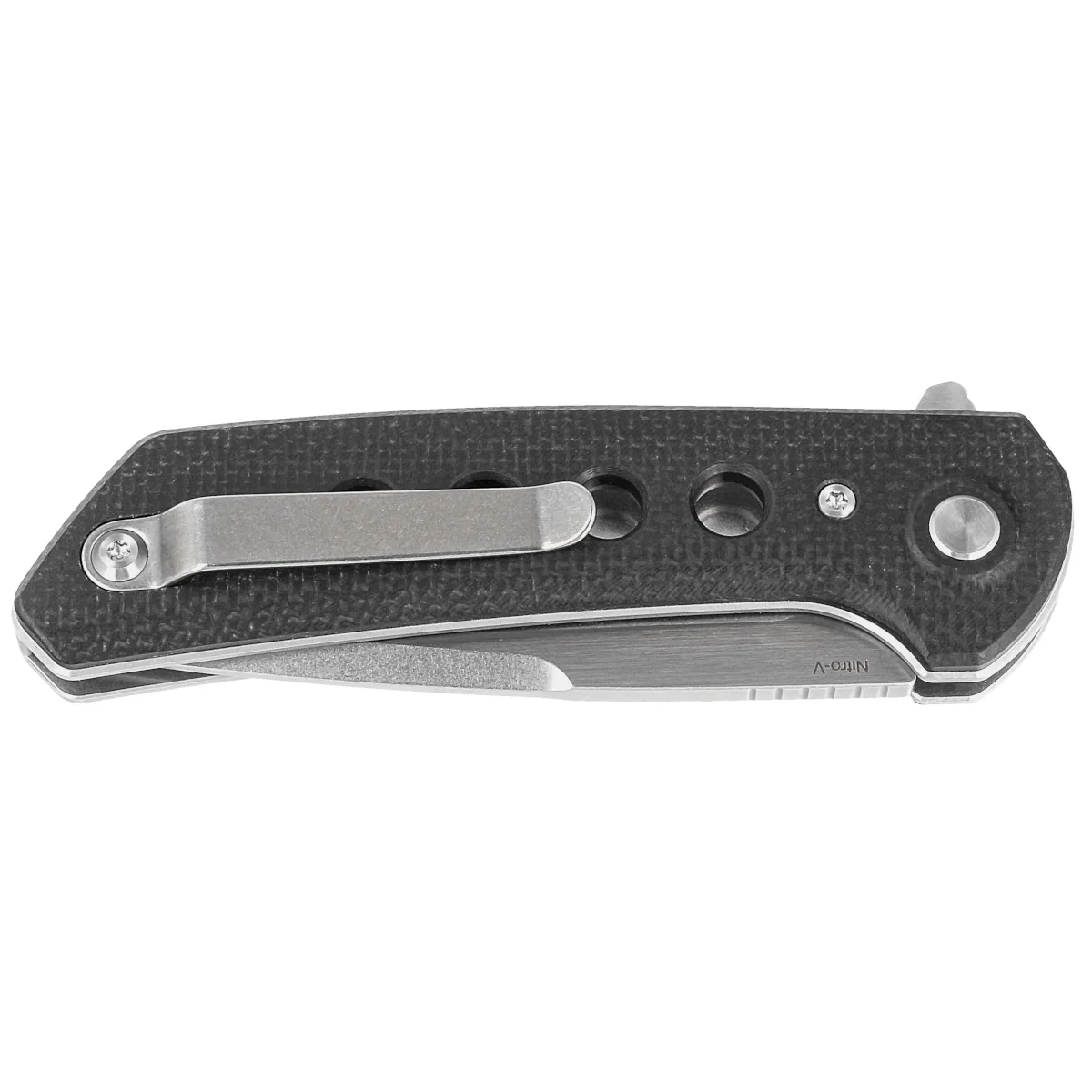 Handle - grips made of Micarta, a practically indestructible material that is insensitive to weather conditions, resistant to chemicals and mechanical damage. Handle holes inlaid with G10 composite. Chamfered cover edges eliminate sharp edges and characteristic surface texturing improves grip security. The massive backspacer to which the grips are attached guarantees the rigidity and strength of the entire structure. On the left side of the slide locking the possibility of accidental release of the lock. The two-position (right/left) clip allows you to carry the knife in tip-up position , with the tip of the blade upwards.