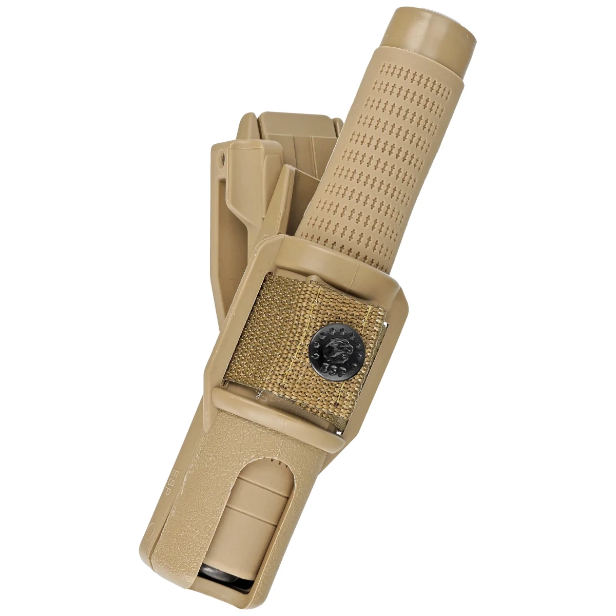 Professional 16-inch hardened expandable baton by Czech company ESP  with an Ergonomic handle, featuring the Friction Loc mechanizm. Designed in a military-style version with a khaki-colored handle and holder. This compact baton is ideal for users who value low weight, discreet carry, and ease of use. Made from hardened steel, it offers exceptional durability and reliability-perfect for intensive, professional use. The set includes a professional, made of durable polymer, detachable 360° rotating holder BH-54, along with a UBC-5 mount equipped with the Quick Change System.