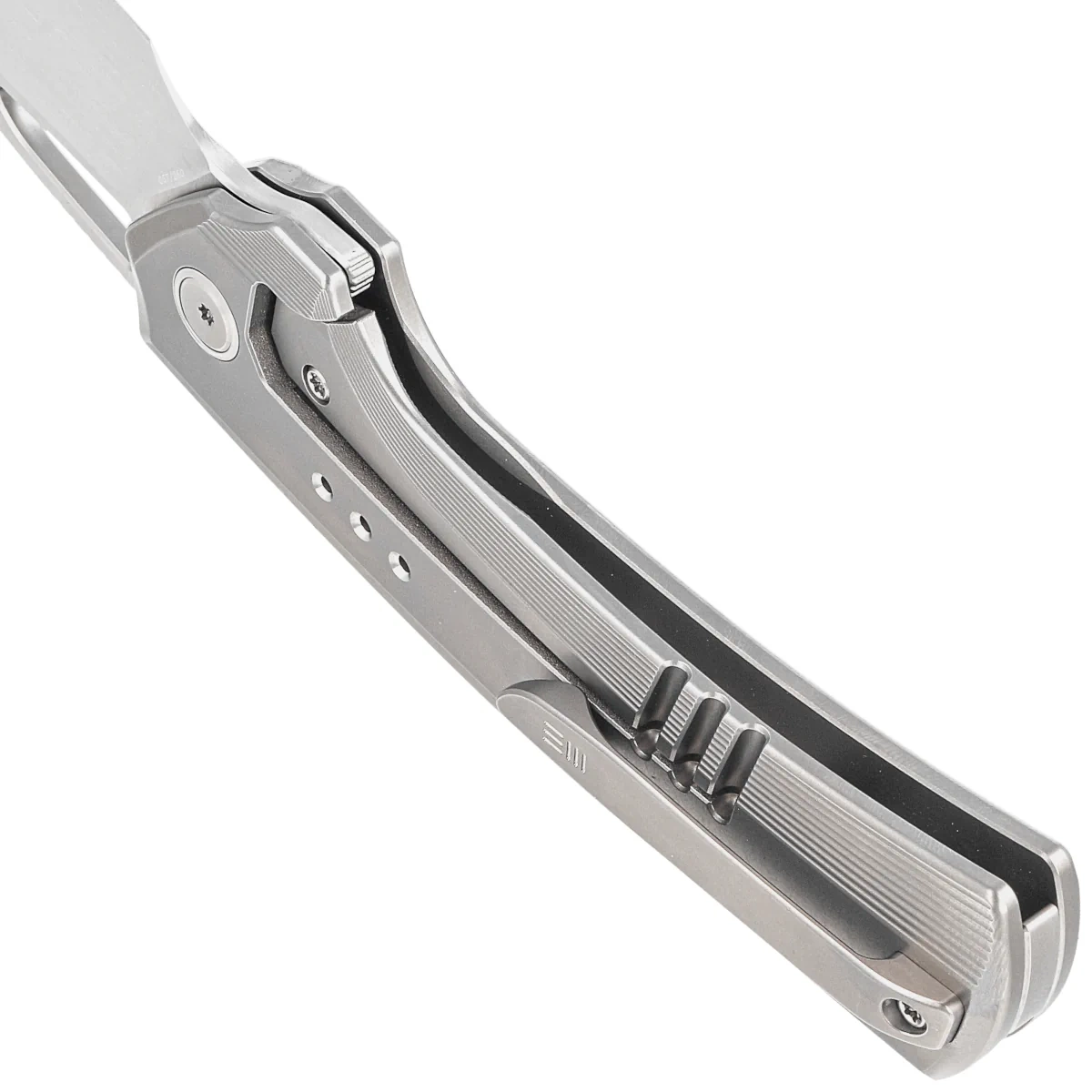 Handle - is thick pieces of titanium 6AL4V, beautifully milled with the help of CNC machine tools, Bead Blasted and polished finish. On the presentation side there is an inlay made of flame-dyed titanium, on the locking side there are holes adding visual lightness. Only a few companies are able to make a Handle with such incredible accuracy! The titanium backspacer to which the grips are attached guarantees the rigidity and strength of the entire structure. The simplicity and solidity of the construction give the assurance of many years of use. The single-position clip (right), made of titanium, allows you to carry the knife in tip-up position. The pivot axis decorated with a gray rim (pivot collar cap). In the hidden recess of the backspacer you will find a place to thread a safety or decorative cord.