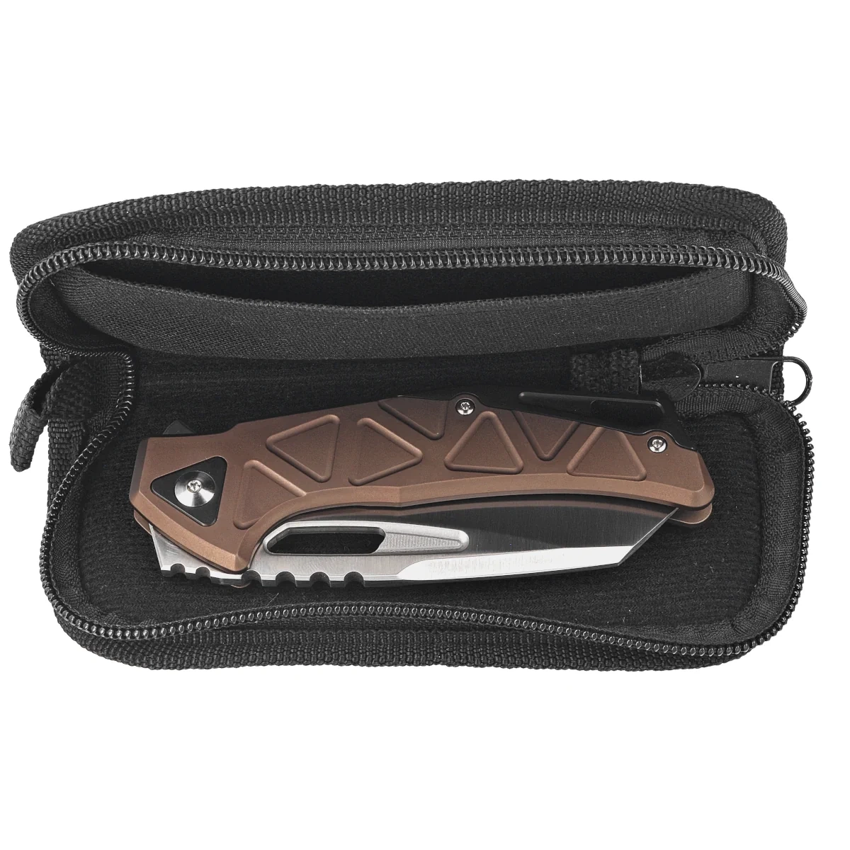 Handle - grips made of aluminum. Perfectly milled with CNC machine tools, with a distinctive pattern of triangles on the Handle. in addition to visual appeal, the texture helps to maintain a firm grip. The massive backspacer gives the whole structure the desired rigidity. The simplicity and sturdiness of the construction give assurance of many years of use. Black accents contrast beautifully with the bronze anodization. Single-position (right)clip , allows the knife to be carried in tip-up position. Above the clip a lanyard hole, a hole for threading a decorative or safety cord.