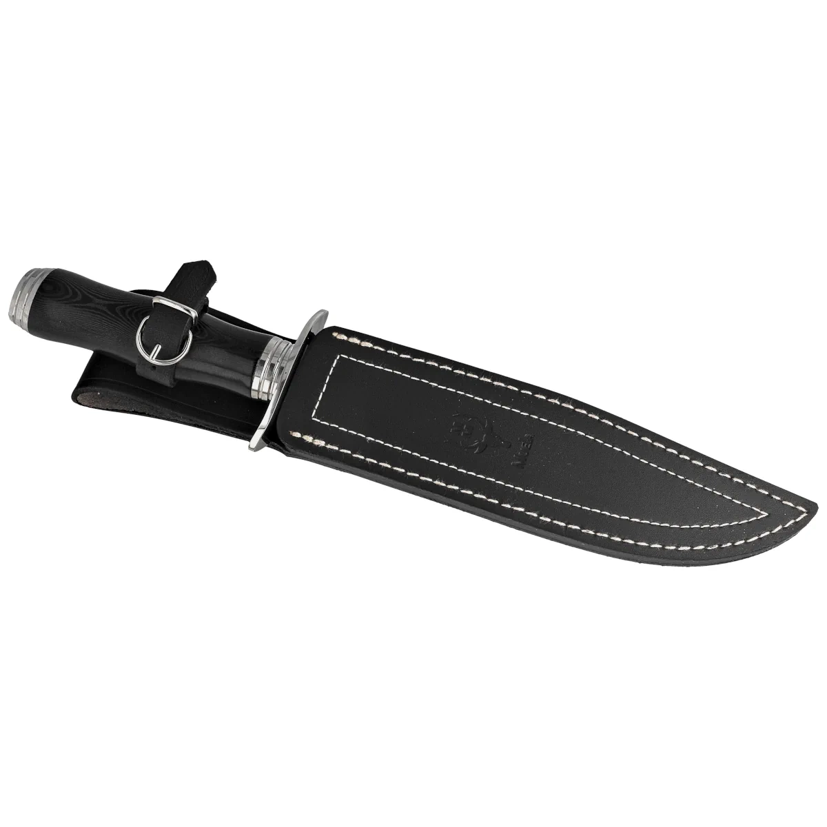 Urial-19M Black Micarta, Satin, a large hunting and outdoor knife made of X50CrMoV15 stainless steel. Micarta composite handle guarantees a comfortable and secure grip. Hand-stitched leather sheath included. Will not fail in any situation!