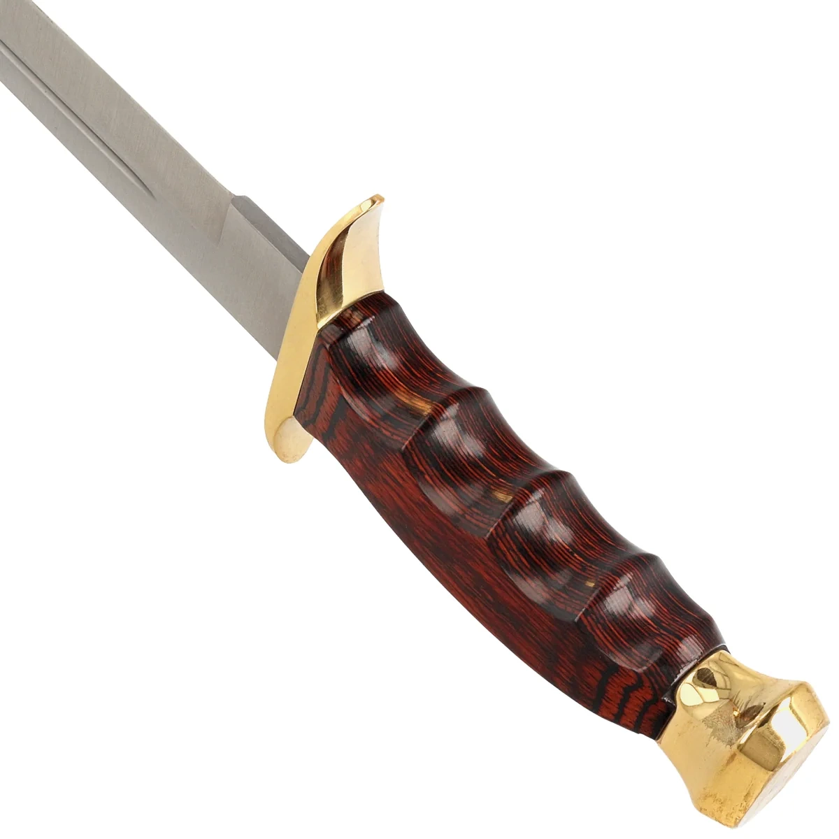 Handle - made of Pakka wood. The profiled Handle eliminates sharp edges for comfortable grip and the texture on the surface improves grip confidence. A decorative pin with the company's logo adds an elegant touch. Guard and Pommel made of brass.
