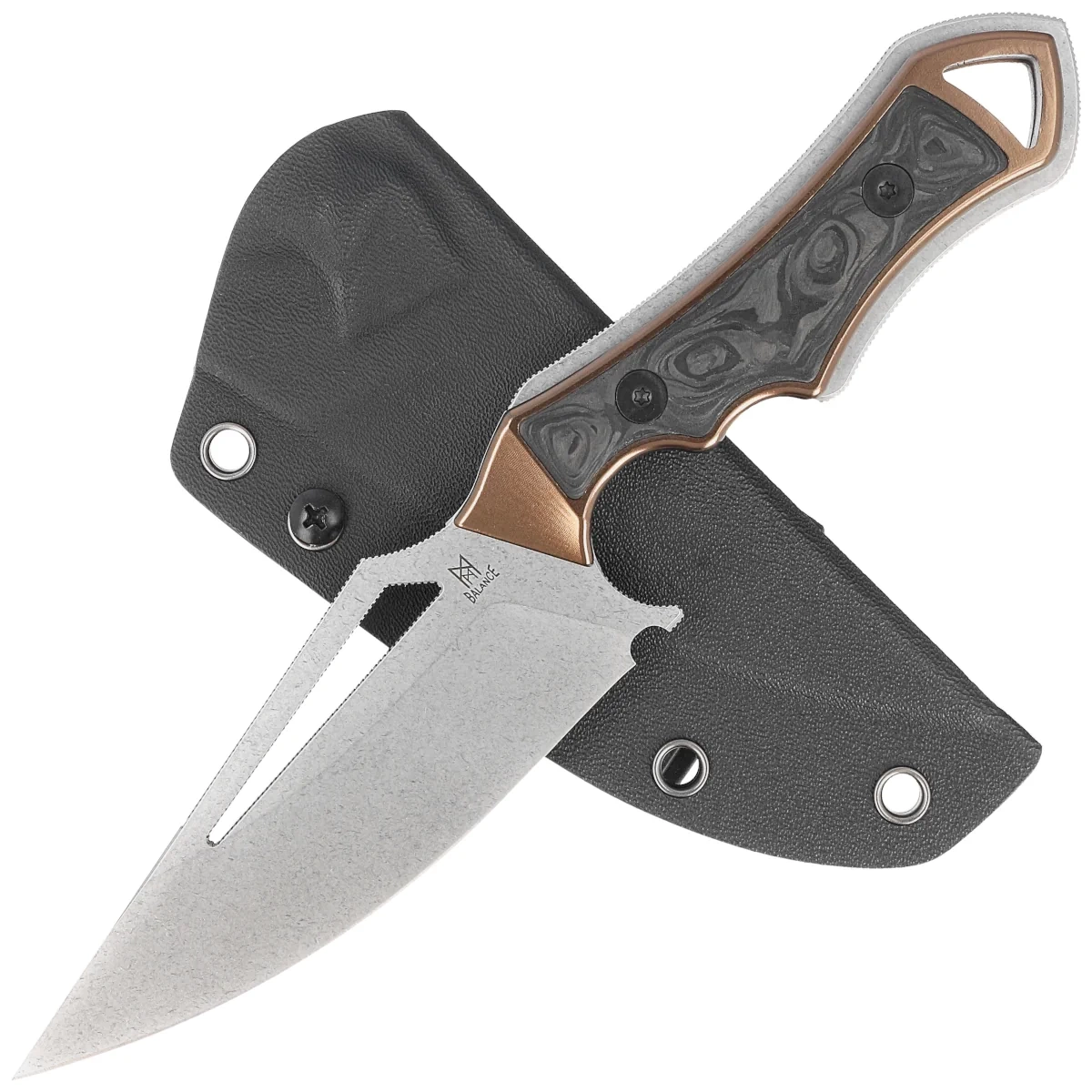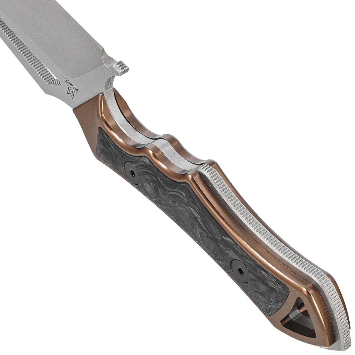 The Brown Kattegat LE ???/150 Carbon Fiber/Brown Aluminum, Satin limited to 150 pieces edition fixed blade knife. Inspired by the shape of Viking drakkars. Perfectly balanced, ergonomic handle made of aluminum, carbon fiber inlays, provides a secure and comfortable grip in the most demanding conditions. The high-quality Sandvik 14C28N stainless steel blade has excellent sharpness retention, making it the perfect tool for professionals and outdoor enthusiasts. The flat kydex sheath, equipped with the Tek-Lok attachment system, which ensures easy and secure carrying of the knife.