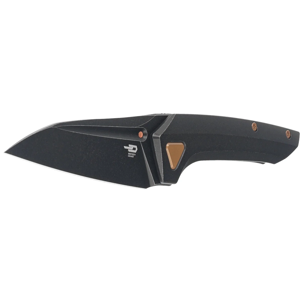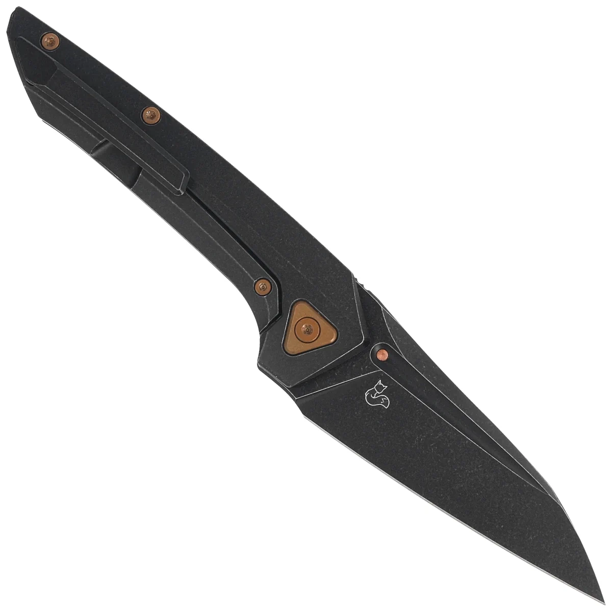 Handle - solid titanium 6AL4V in black and bronze colors, joined together by a solid titanium backspacer. The simplicity and solidity of the design give the assurance of many years of use. The pivot axis has been placed inside a triangular steel inlay. Single-position clip (right), made of titanium, allows you to carry the knife in tip-up position.
