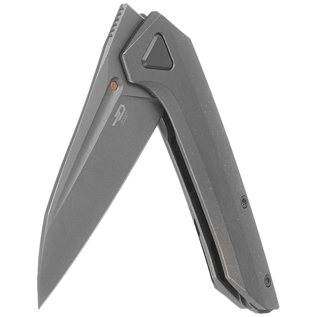 Handle - solid titanium 6AL4V, glazed for better grip. Joined together by a solid titanium backspacer. The simplicity and solidity of the design give the assurance of many years of use. The pivot axis was placed inside a triangular steel inlay. Single-position clip (right), made of titanium, allows you to carry the knife in tip-up position.