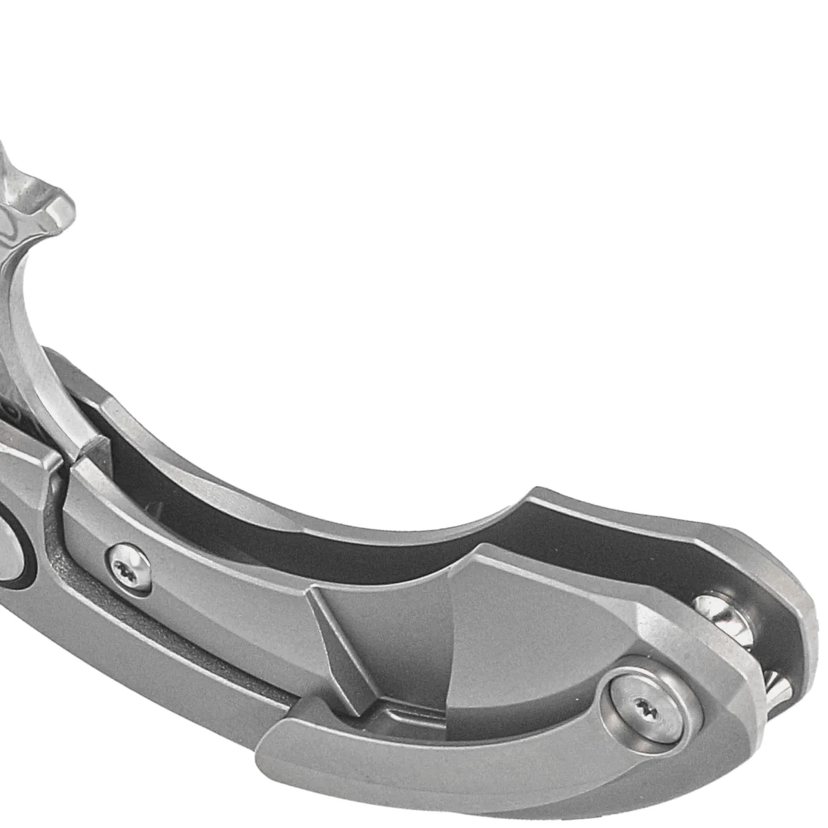 Blade - Hawkbill type. The hollow cutting edge converges towards the needle-sharp tip of the knife. The thickness of the blade provides high strength while the high, flat grind gives excellent cutting edge geometry and extreme cutting performance. Ceramic ball bearings support the opening of the blade with a quick flipper (index-finger flipper). The entire blade is locked with the proven and popular frame lock with a steel inlay to prevent wiping of the lock face. When opened, the constriction just behind the blade allows you to comfortably grip the knife with a clenched hand, in the push-dagger position. The blade then protrudes from between your fingers like a predatory claw!
