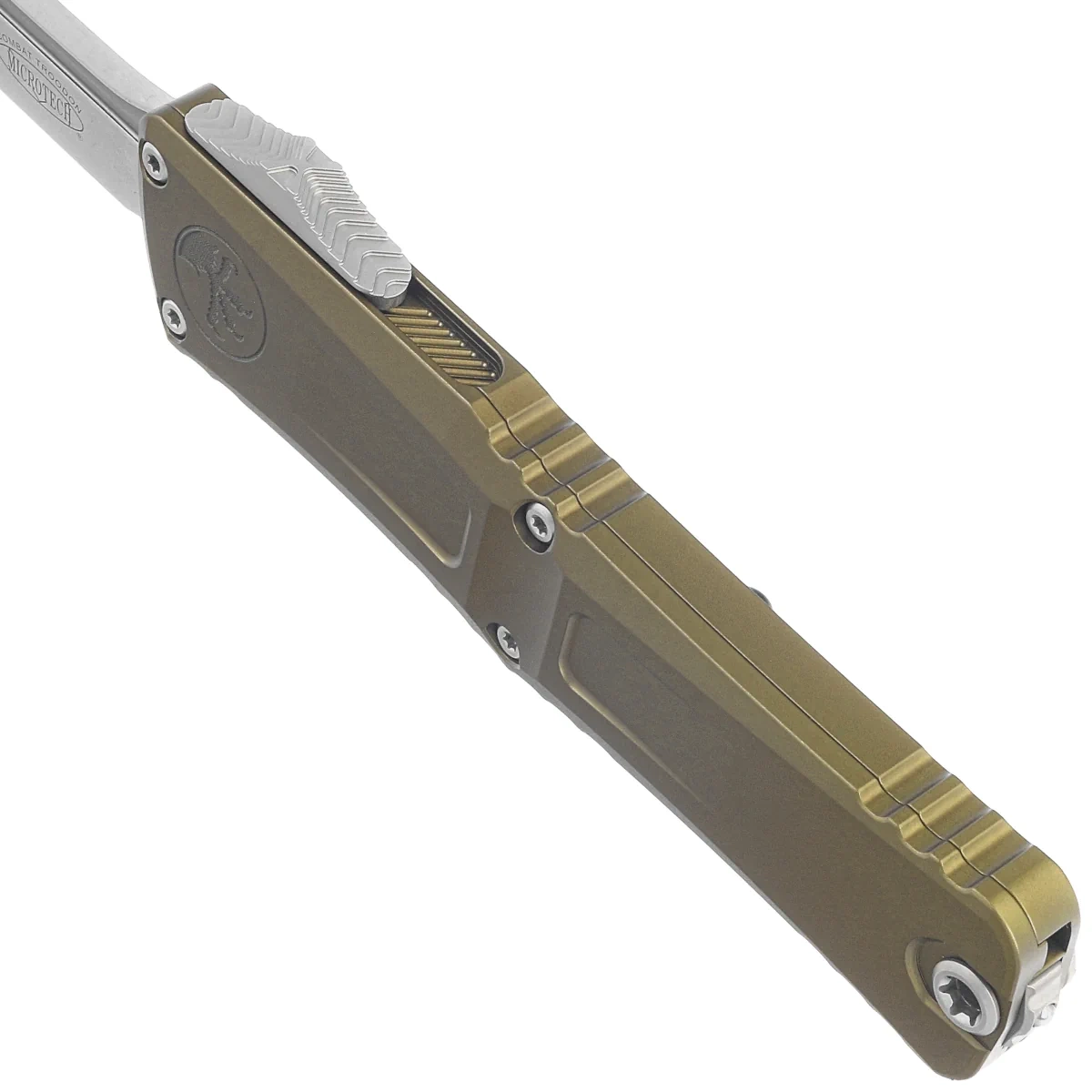 Combat Troodon Gen III T/E OD Green Aluminum, Stonewashed this largest of the automatic knives, is the pinnacle of precision engineering and tactical prowess in the field of OTF (Out The Front) knives. Built for a wide range of utility applications, it boasts a 25% larger size compared to the flagship Troodon. Precisely crafted, it features a sophisticated and hellishly fast mechanism that extends the razor-sharp blade. 100% made and assembled in the USA. Designed by Anthony Marfione, knifemaker and owner of Microtech Knives.