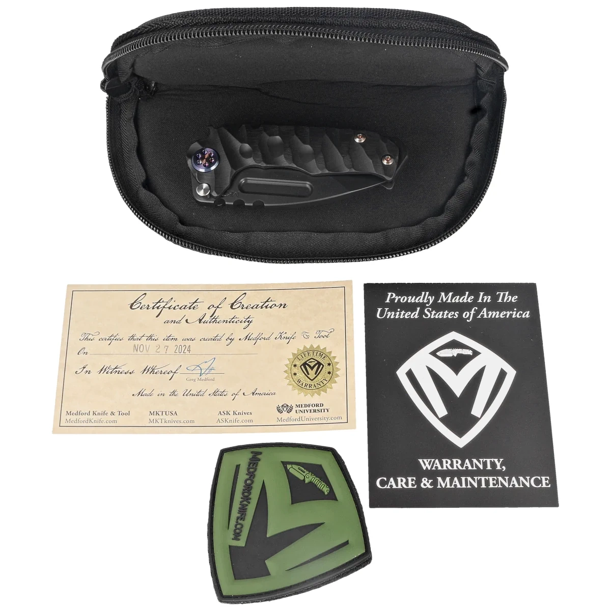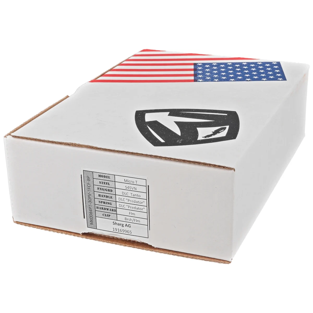 Micro Praetorian T Tanto, Black DLC “Predator” Titanium, Flamed HW, Brushed/Flamed Clip, Black DLC smaller version of the famous Medford Praetorian T. Rugged and extremely sturdy, massive CPM S45VN steel Blade, powerful Titanium Handle. 100% made in the United States, with American materials, by a company run by veterans. The hollow grind on the blade has been crafted by hand - a rarity in the knife industry, achieved by only a select few manufacturers capable of executing such precision.