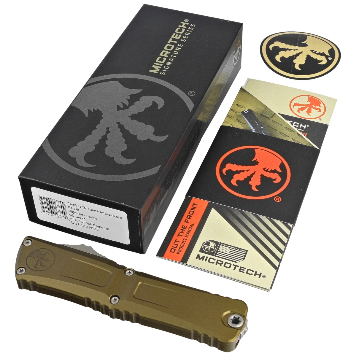 Microtech Combat Troodon Gen III Interceptor OTF Knife OD Green Aluminum, Apocalyptic M390MK by Tony Marfione (1217-10APODS)