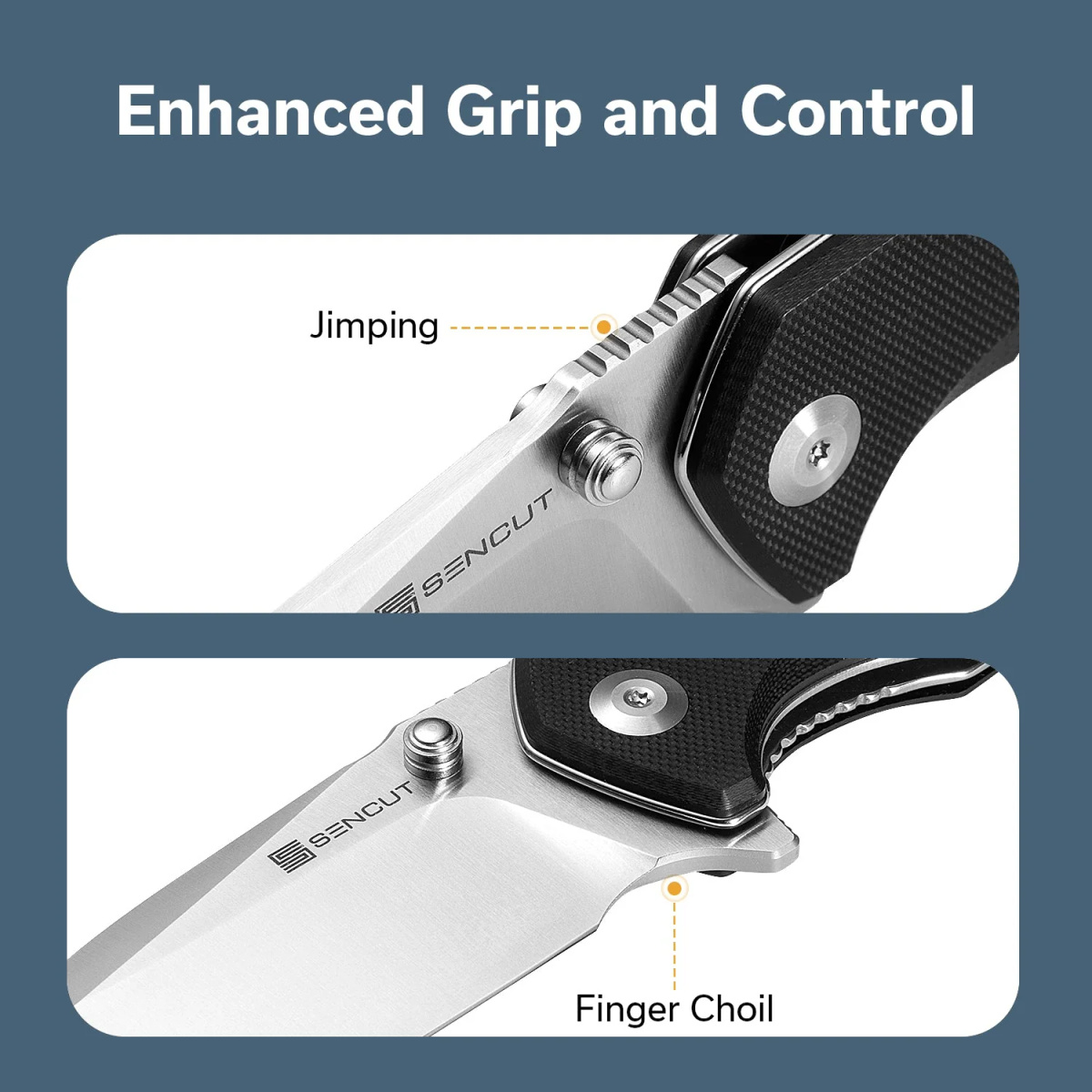 - Skarnax Black G10, Satin large EDC folder designed for daily use. Features a full-size G10 composite handle and a blade made of 9Cr18MoV stainless steel. It can be opened in two ways: using the flipper or the dual thumb studs on the blade.