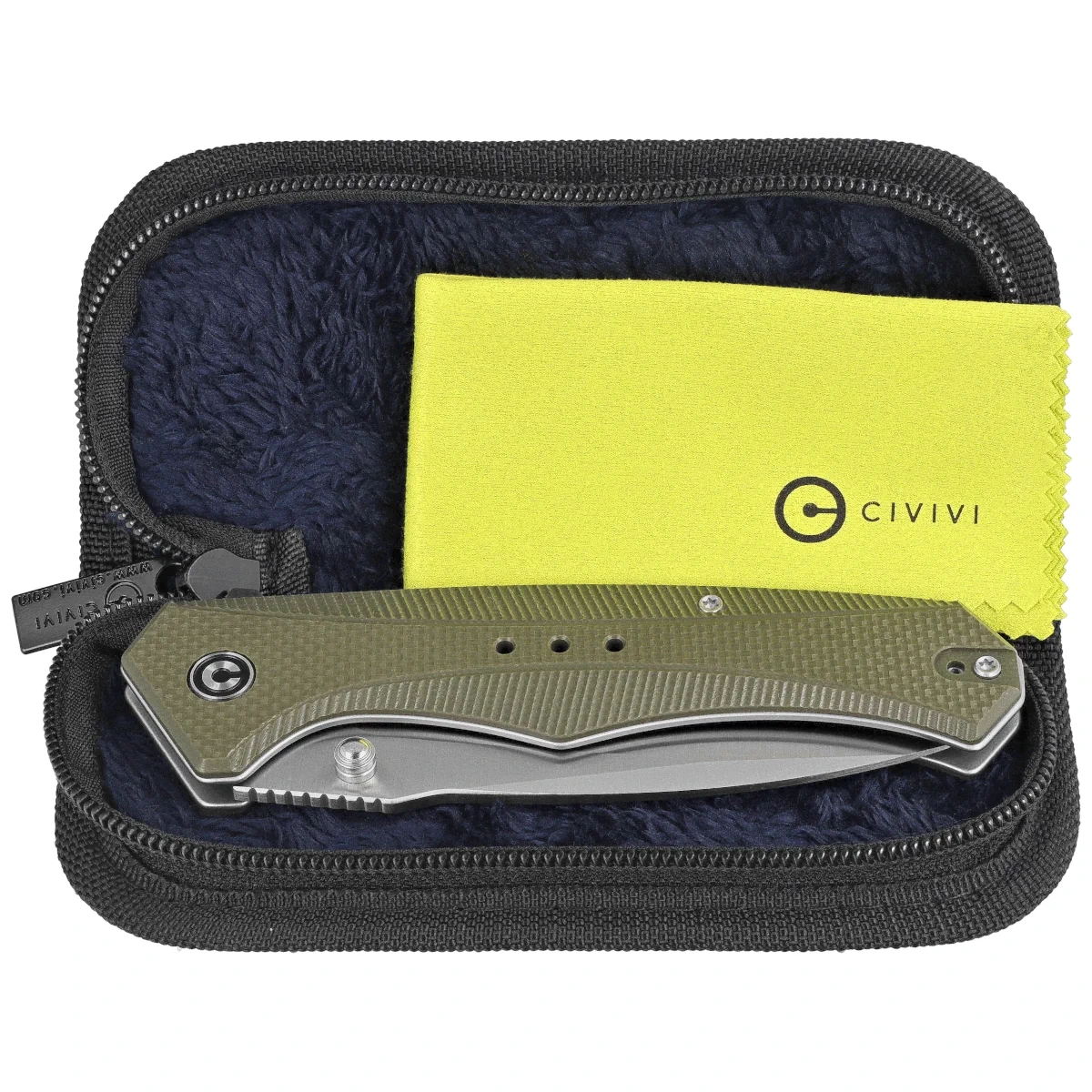 Handle - made of G10 composite, practically indestructible plastic, insensitive to weather conditions, resistant to chemicals and mechanical damage. The chamfered edges of the covers eliminate sharp edges and the rough textured and textured surface enhances comfort and sure grip. The open-backed design, fixed with steel spacer sleeves, reduces weight and facilitates cleaning. The pivot axis is decorated with a stylized Civivi brand logo. A two-position, right/left deep carry clip allows you to carry the knife discreetly in your pocket in tip-up position (blade tip up).