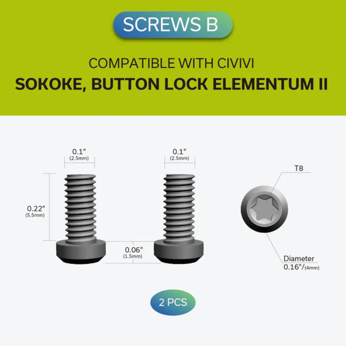 - Gray Titanium Civivi Pocket Clip with 2 pairs of Gray Titanium Trox T8 Screws for WE and Civivi knives. Two different screw sets (screws A and screws B) allow the clip to be mounted on various folder models with compatible hole spacing.