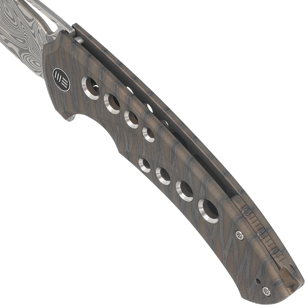 Handle - made of polished titanium 6AI4V heat stained in Tiger Stripes pattern, machined on CNC milling machines. The titanium backspacer to which the grips are attached guarantees the rigidity and strength of the entire structure. The simplicity and solidity of the construction give confidence in many years of use. A series of satin-finished holes were made on both sides, which not only reduce the weight of the knife, but at the same time add visual lightness. The two-position clip (right/left), made of titanium, allows the knife to be carried in tip-up position. The pivot axis is made of titanium and decorated with a Damasteel rim (pivot collar cap). In the upper part of the backspacer lanyard hole, a hole for a safety or decorative cord.