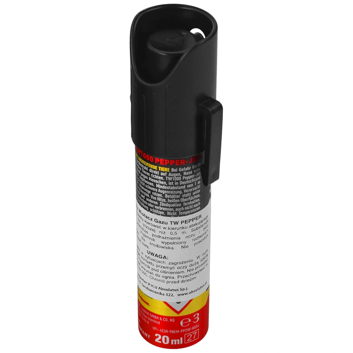 - TW1000 Pepper‑Jet Lady 20ml compact pepper spray designed for effective self‑defense. With 10%OC concentration and heat level of 2 million Scoville Heat Units, it provides reliable protection even against aggressors under the influence of alcohol or drugs