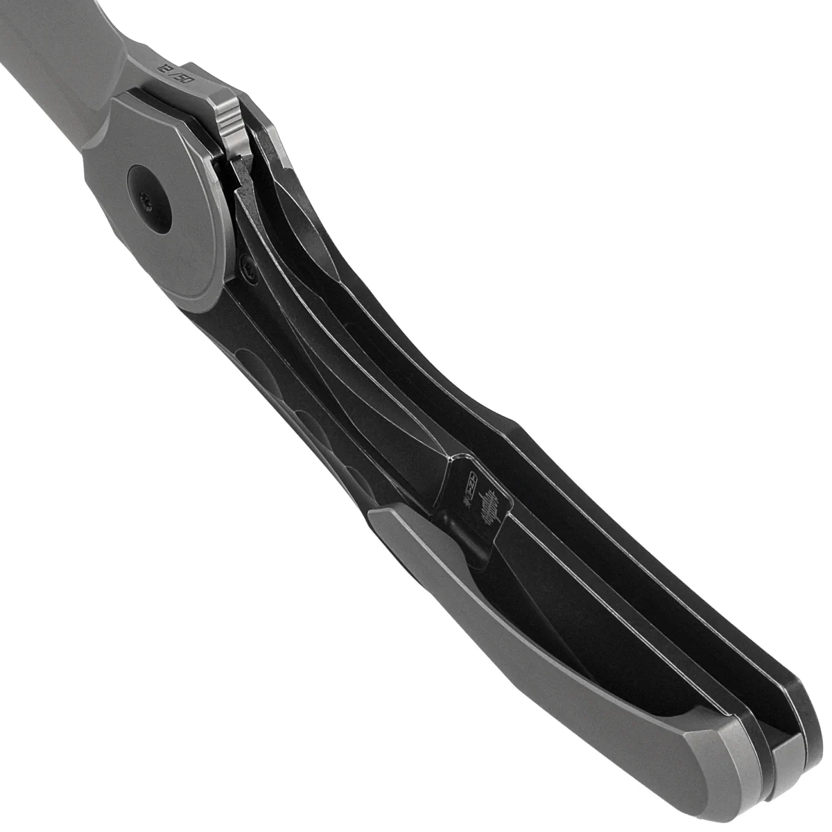Handle - made of milled titanium 6AL4V, beveled edges of the covers eliminate sharp edges. The whole bolted to a solid backspacer, also made of titanium. The pivot axis is decorated with a bolster made of titanium in a contrasting color. A fore finger groove improves grip security. A single-position (right) titanium deep-carry clip allows you to carry the knife discreetly in your pocket in tip-up (blade tip up) position.