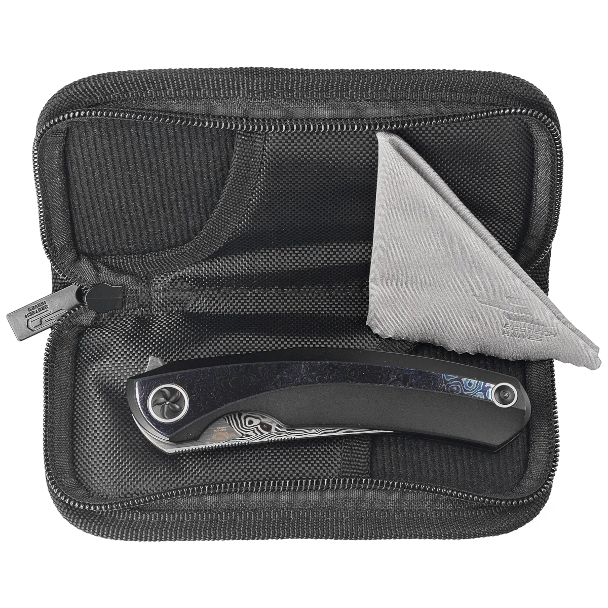 Case - the knife is packed in a zippered nylon soft pouch with the brand's logo for safe carrying and storage of the folder.