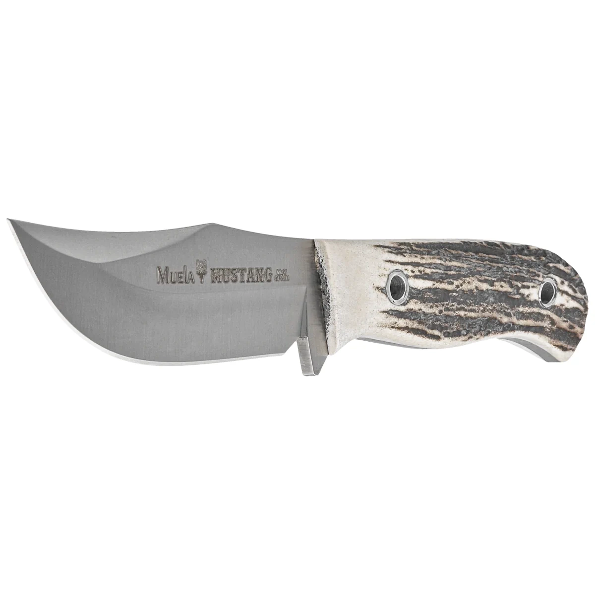 - Mustang-8A Red Deer Stag, Satin, a rugged hunting and outdoor knife made of MoVa molybdenum-vanadium steel. Providing an exclusive look, the handle is made of deer antler. Hand-stitched leather sheath included.