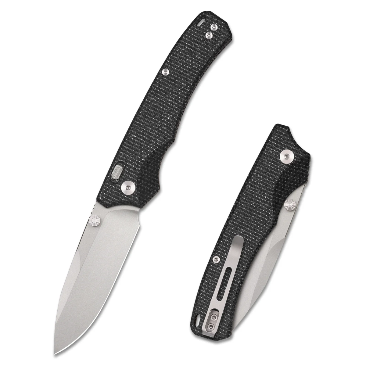 Handle - made of Micarta composite, practically indestructible plastic, insensitive to weather conditions, resistant to chemicals and mechanical damage. The grips are screwed to a solid backspacer, giving confidence in maintaining the desired rigidity of the entire structure. On the left side, a wide Button Lock button, located in a recess to avoid accidental opening. A single-position (right) deep-carry clip allows you to carry the knife discreetly in your pocket in tip-up position (blade tip up). Above the clip is a hole (Lanyard hole) for threading a safety or decorative cord.