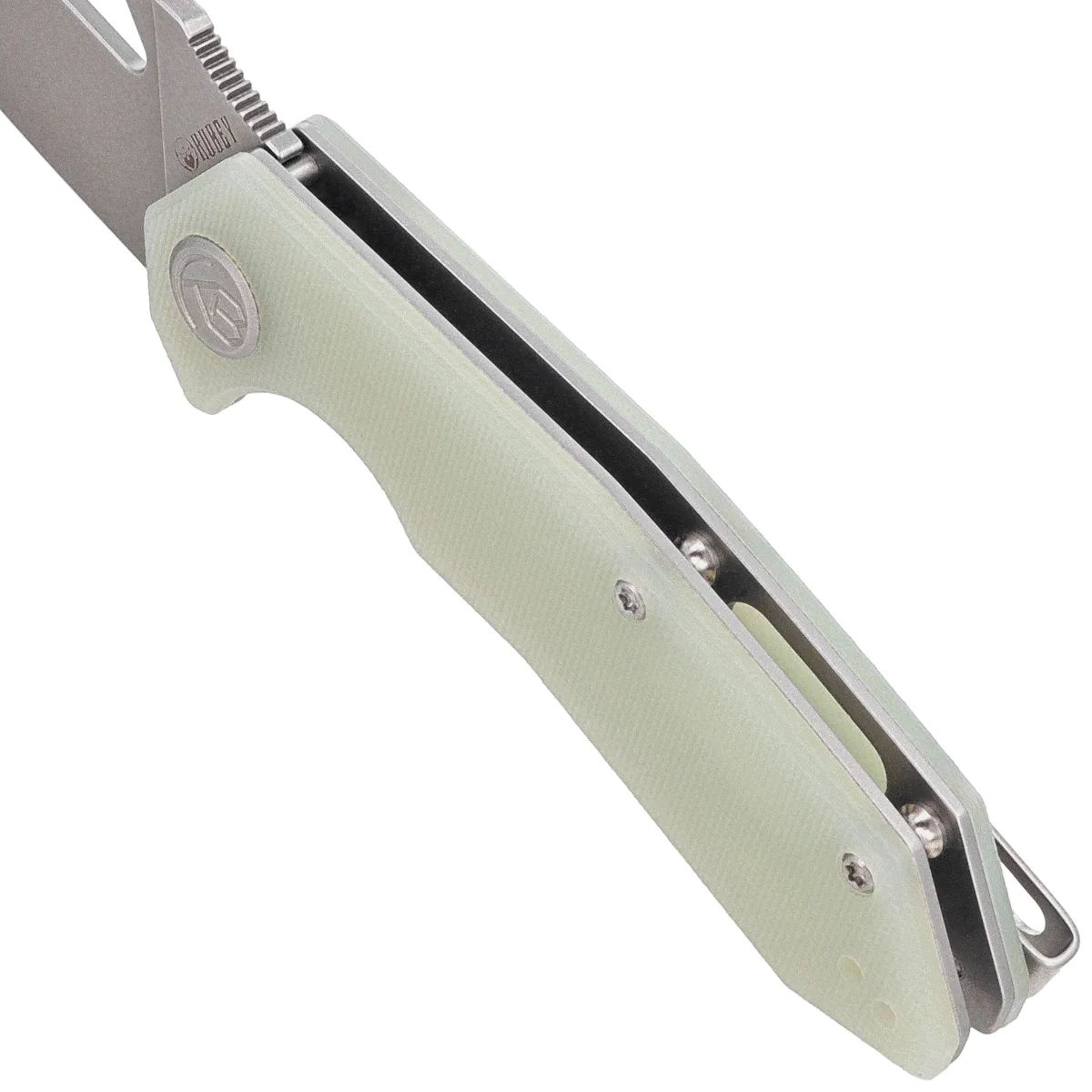 Handle - grips made of G10 composite, practically indestructible plastic, insensitive to weather, resistant to chemicals and mechanical damage, textured to improve grip, screwed to the steel frame of the knife. The so-called open-backed design without the typical backspacer, fastened together with steel spacer sleeves for easy cleaning. The simple, secure design gives assurance of many years of use. A fore finger groove improves grip security and creates a mini-guard to prevent the hand from slipping on the blade. The pivot is decorated with a stylized manufacturer's logo. A two-position (right/left) metal deep-carry clip allows you to carry the knife discreetly in your pocket in tip-up (blade tip up) position.