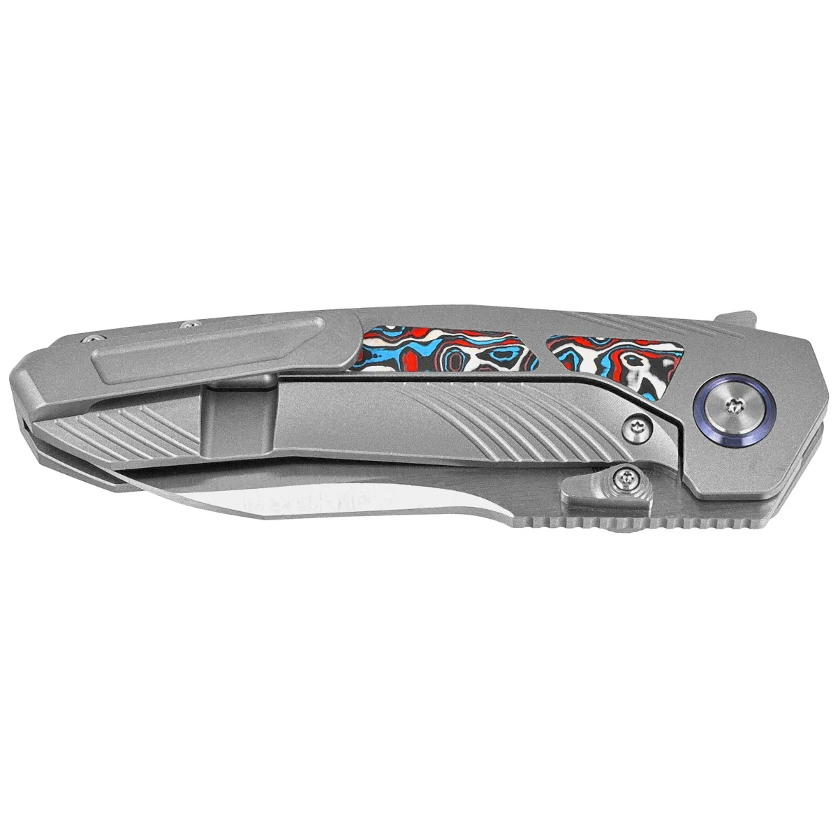 Handle - is thick pieces of titanium 6AL4V, contouring of the covers eliminates sharp edges. On both sides there is an inlay (insert) made of Multicolored Carbon Fiber composite. Only a few companies are able to make the Handle with such incredible accuracy! The grips are joined together using a titanium backspacer. A right-handed, single-position titanium deep-carry clip allows you to carry the knife discreetly in your pocket in tip-up (blade up) position. The pivot axis is decorated with a titanium rim (pivot collar cap).
