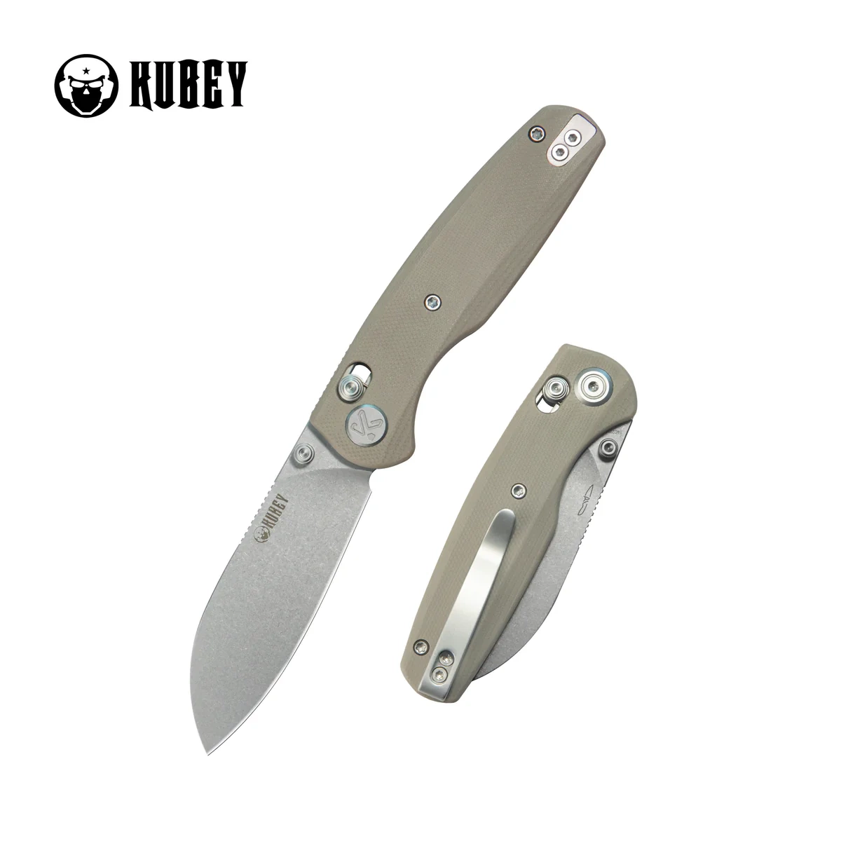 Handle - is two pieces of composite G10, a material extremely mechanically durable and practically completely resistant to weather conditions and chemicals, textured for improved grip security, screwed to the steel frame of the knife. The chamfered edges of the covers eliminate sharp edges for comfort and improve grip confidence. Serio holes in the Handle add visual lightness and relieve stress on the knife. The lightweight backspacer provides the desired rigidity and strength of the design The simple, secure design gives confidence for years of use. A deep finger undercut (fore finger groove) improves grip confidence. The pivot axis is adorned with a stylized Kubey Knife brand logo. A two-position (right/left) deep carry clip allows you to carry the knife discreetly in your pocket in the tip-up (blade tip up) position.