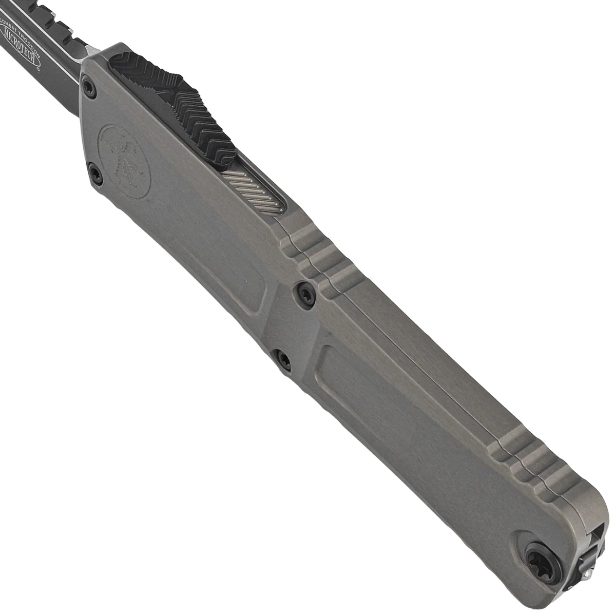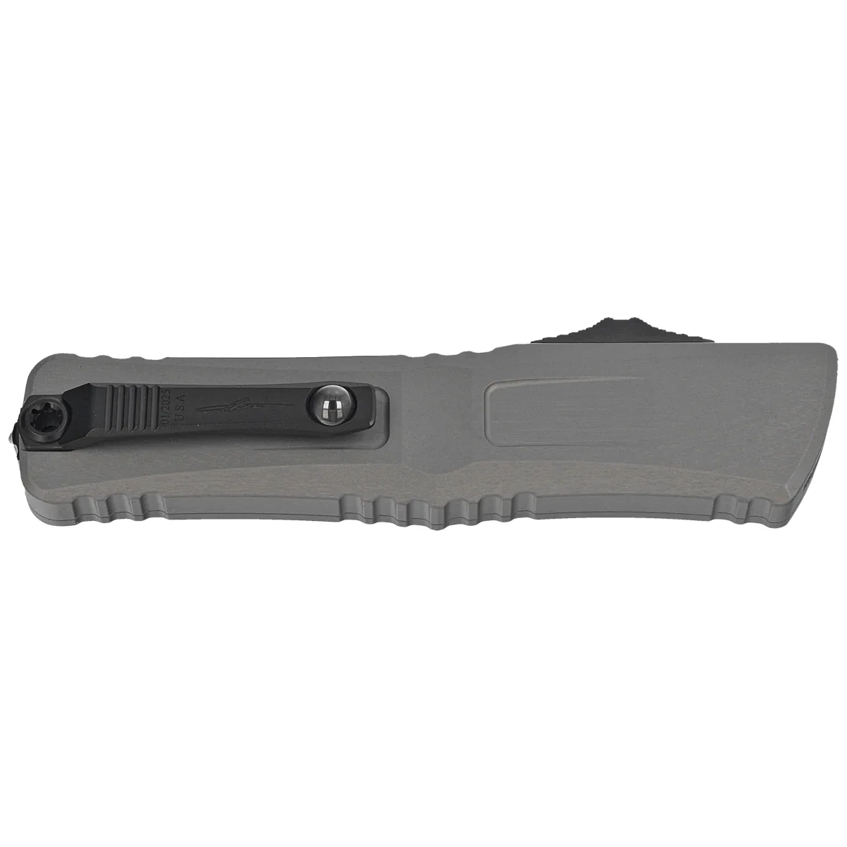 Combat Troodon Gen III Interceptor Signature Natural Clear Aluminum, Black the largest of the automatic knives, is the pinnacle of precision engineering and tactical efficiency in the field of OTF (Out The Front) knives. Built for a wide range of utility applications, it boasts a 25% larger size compared to the flagship Troodon. Precision-crafted, equipped with a sophisticated and extremely fast retractable mechanism, and a new type of razor-sharp blade - Interceptor. 100% manufactured and assembled in the USA. Designed by Anthony Marfione, knifemaker and owner of Microtech Knives.