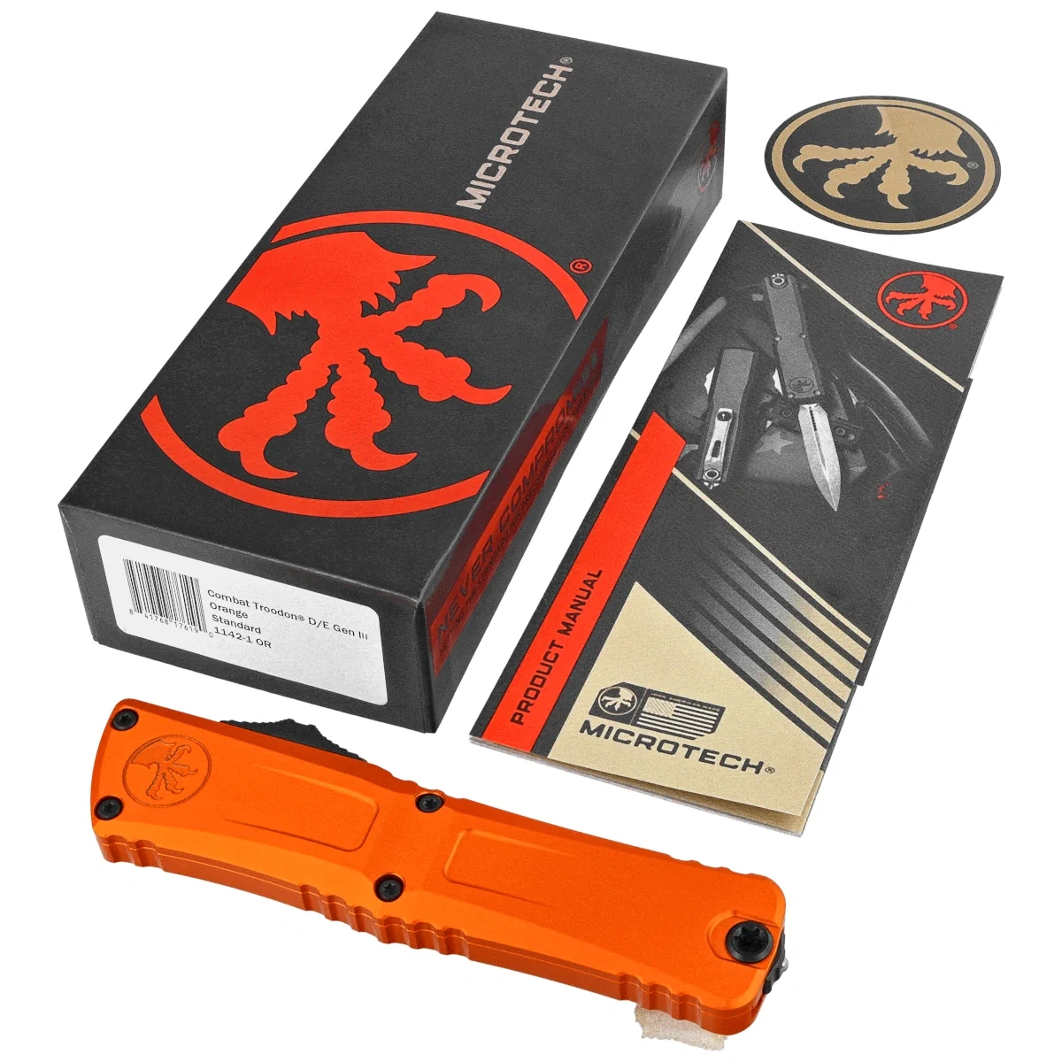 Combat Troodon Gen III D/E Orange Aluminum, Black the largest of the automatic knives, is the pinnacle of precision engineering and tactical efficiency in the field of OTF (Out The Front) knives. Built for a wide range of utility applications, it boasts a 25% larger size compared to the flagship Troodon. Precision-crafted, equipped with a sophisticated and extremely fast retractable mechanism and a razor-sharp blade. 100% made and assembled in the USA. Designed by Anthony Marfione, knifemaker and owner of Microtech Knives.