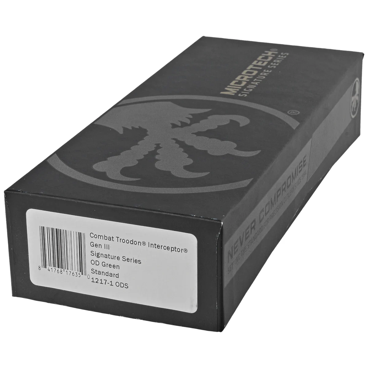 Combat Troodon Gen III Interceptor Signature OD Green Aluminum, Black the largest of the automatic knives, is the pinnacle of precision engineering and tactical efficiency in the field of OTF (Out The Front) knives. Built for a wide range of utility applications, it boasts a 25% larger size compared to the flagship Troodon. Precision-crafted, equipped with a sophisticated and extremely fast retractable mechanism, and a new type of razor-sharp blade - Interceptor. 100% manufactured and assembled in the USA. Designed by Anthony Marfione, knifemaker and owner of Microtech Knives.
