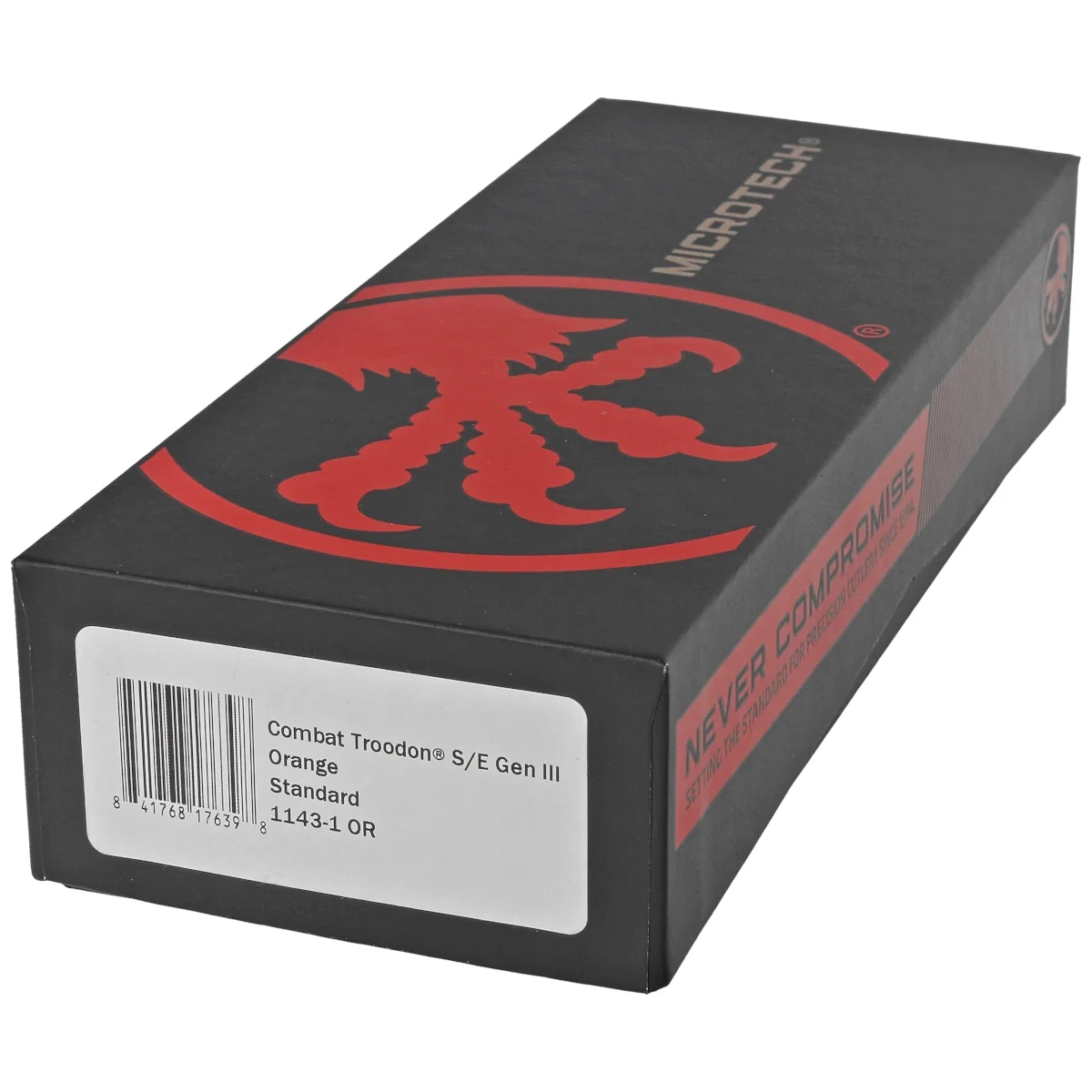 Combat Troodon Gen III S/E Orange Aluminum, Black the largest of the automatic knives, is the pinnacle of precision engineering and tactical efficiency in the field of OTF (Out The Front) knives. Built for a wide range of utility applications, it boasts a 25% larger size compared to the flagship Troodon. Precision-crafted, equipped with a sophisticated and extremely fast retractable mechanism and a razor-sharp blade. 100% made and assembled in the USA. Designed by Anthony Marfione, knifemaker and owner of Microtech Knives.