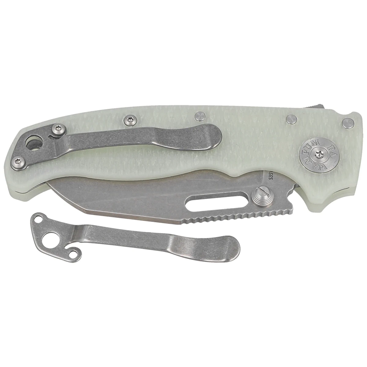 Handle - grips made of G10 composite, a virtually indestructible material that is resistant to weather, chemicals and mechanical damage. The beveled edges of the covers eliminate sharp edges and the characteristic surface texture improves grip. A single-position, right-handed clip allows the knife to be carried in a tip-up position, with the tip of the blade facing up. A clip for left-handers is included in the set.