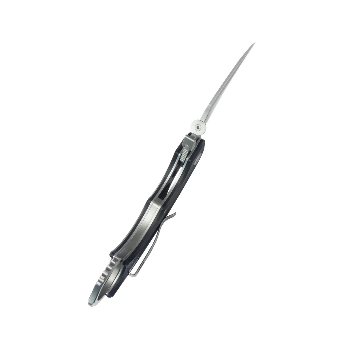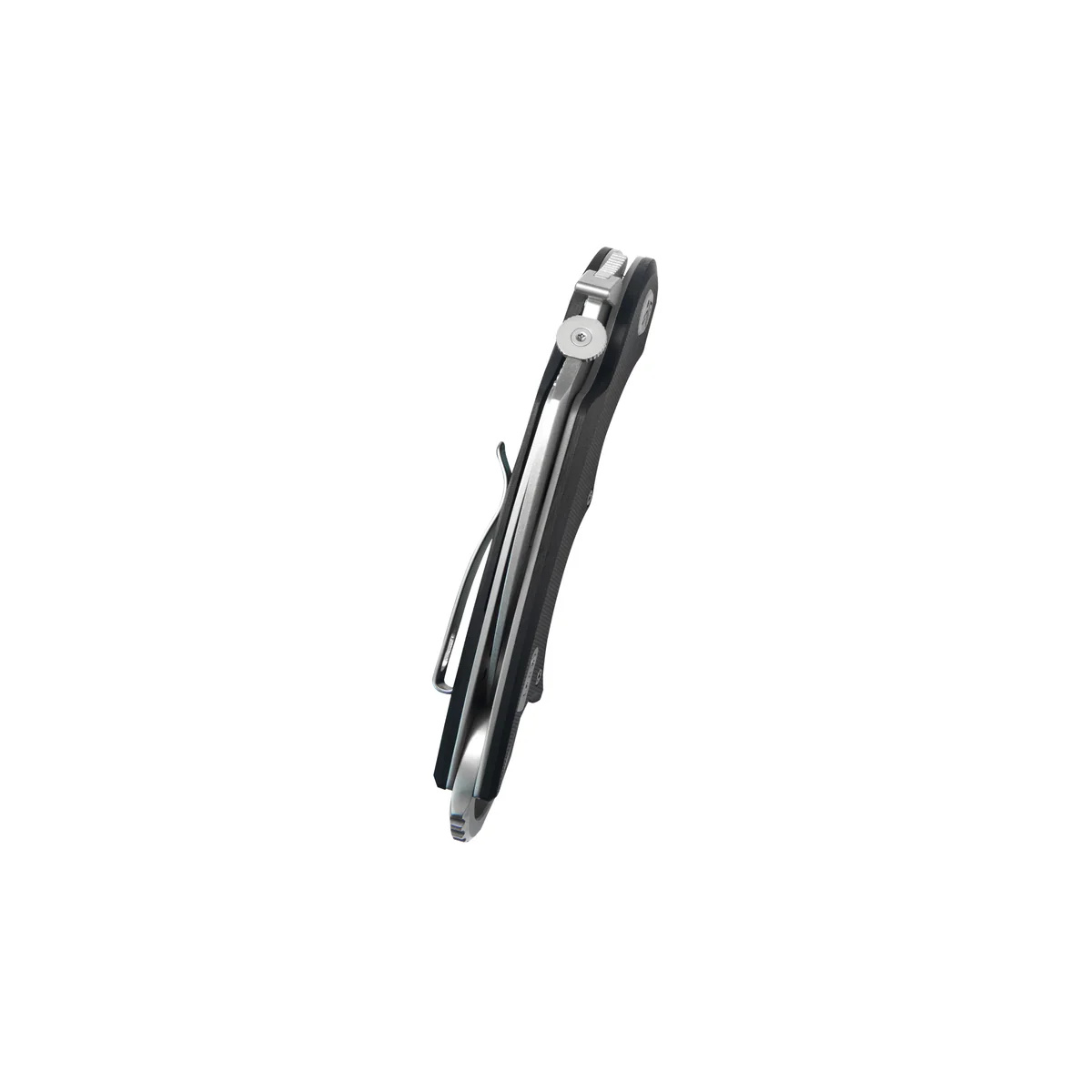 Handle - made of G10 composite, a material with extremely high mechanical strength and virtually complete resistance to weather conditions and chemicals, textured for improved grip. Forefinger groove at the front improves grip. The solid backspacer ends in a finger ring (Back Ring). It prevents the knife from accidentally slipping out of the hand and it also makes it easier to rotate the folder around the finger, enabling traditional techniques. The pivot axis is decorated with a stylized logo. The single-position (left) clip allows the knife to be carried in a tip-up position (tip up).