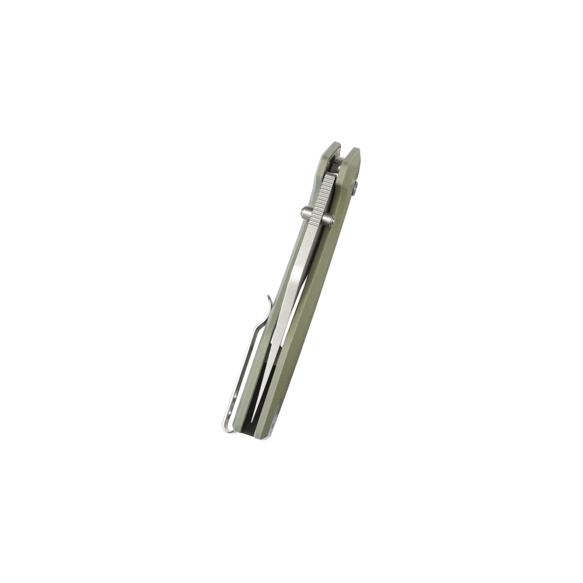 Handle - G10 composite grips, a mechanically extremely durable material that is practically completely resistant to weather conditions and chemicals, textured for better grip, screwed to the steel frame of the knife. A solid backspacer ensures the desired rigidity. The simple, solid design guarantees many years of use. The pivot point is decorated with a stylized manufacturer's logo. The two-position (right/left) metal deep carry clip allows the knife to be carried discreetly in the pocket in a tip-up position (with the tip of the blade up). There is space in the backspacer recess for attaching a safety or decorative cord.