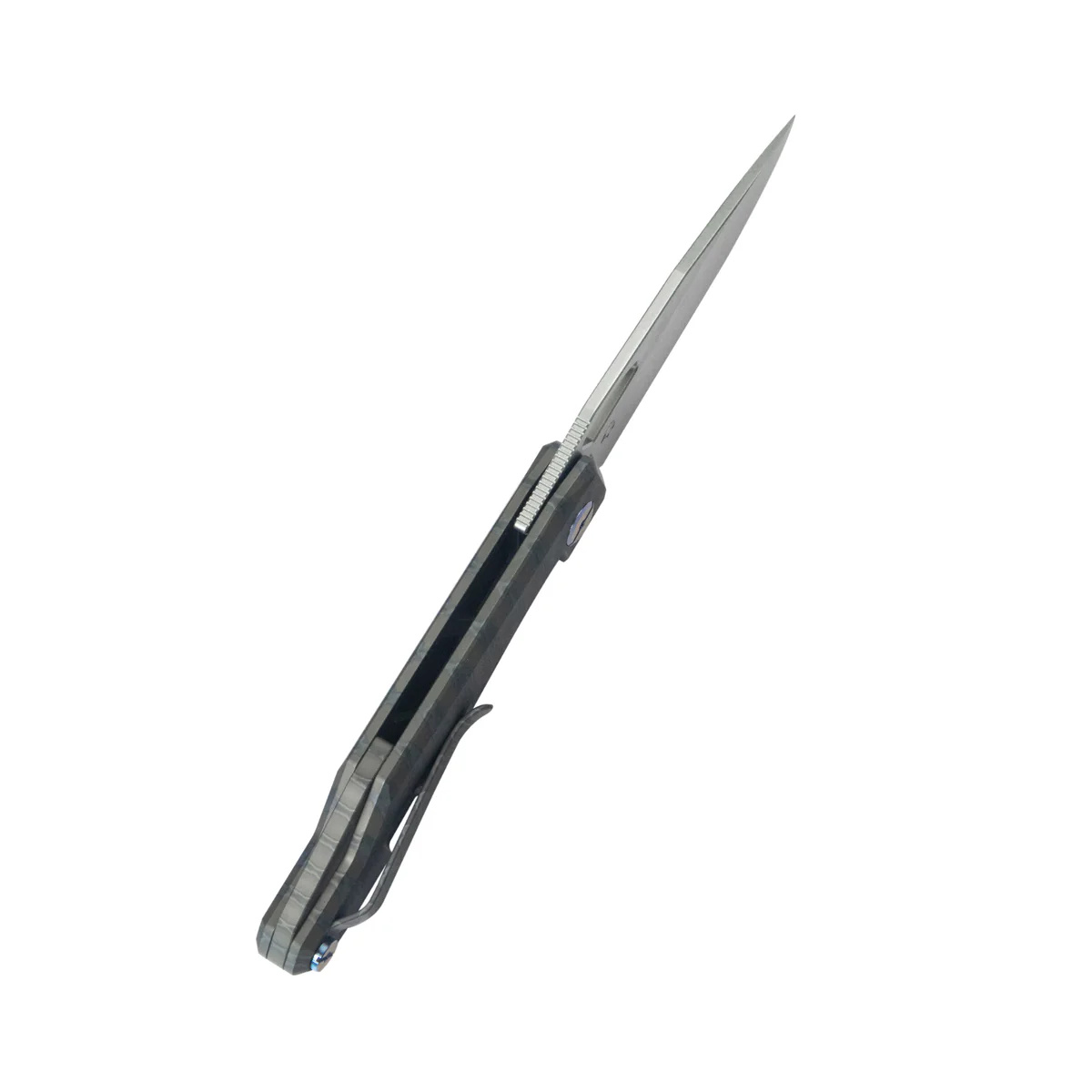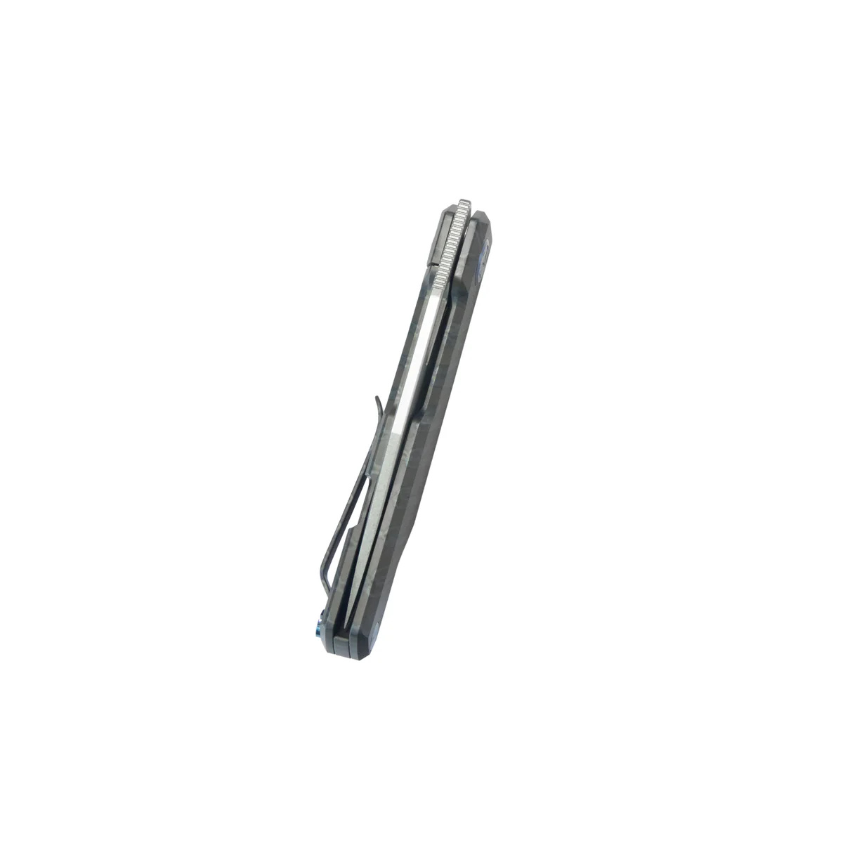 Handle - made of solid titanium 6AL4V with a flame-colored Tiger Stripes pattern, beveled edges of the covers eliminate sharp edges. The slightly rough texture of the handle ensures that the knife does not slip in the hand during use. The whole knife is screwed to a solid backspacer, also made of titanium. The pivot cap is made of titanium in a contrasting color. The forefinger groove improves grip. The single-position (right) titanium deep carry clip allows you to carry the knife discreetly in your pocket in a tip-up position (with the tip of the blade up). There is a hole in the upper part of the backspacer for a safety or decorative cord.