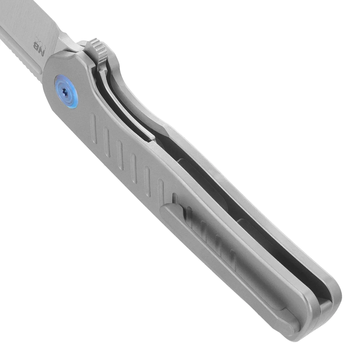 Handle - made of titanium 6AL4V with characteristic transverse grooves, a material with extremely high mechanical strength and practically completely resistant to weather conditions and chemicals. The whole is screwed to a solid backspacer, also made of titanium 6AL4V. The simple, robust design guarantees many years of use. The forefinger groove improves grip. The single-position (right) titanium deep carry clip allows you to carry the knife discreetly in your pocket in a tip-up position (with the tip of the blade up).