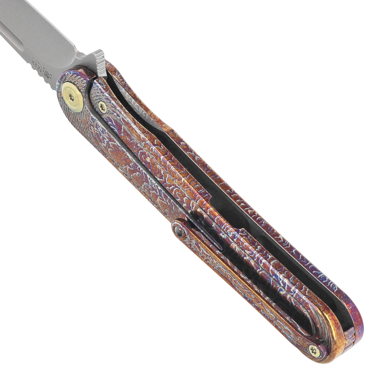 Handle - flame-colored titanium 6AL4V grips. The whole is screwed to a solid backspacer, also made of titanium. The simple, solid construction ensures many years of use. The pivot axis is adorned with a titanium cap (Pivot Cap) in a contrasting color. A single position (right) titanium deep carry clip allows you to carry the knife discreetly in your pocket in a tip-up position (with the tip of the blade up). In the back of the backspacer there is a hidden place to thread a safety or decorative cord.