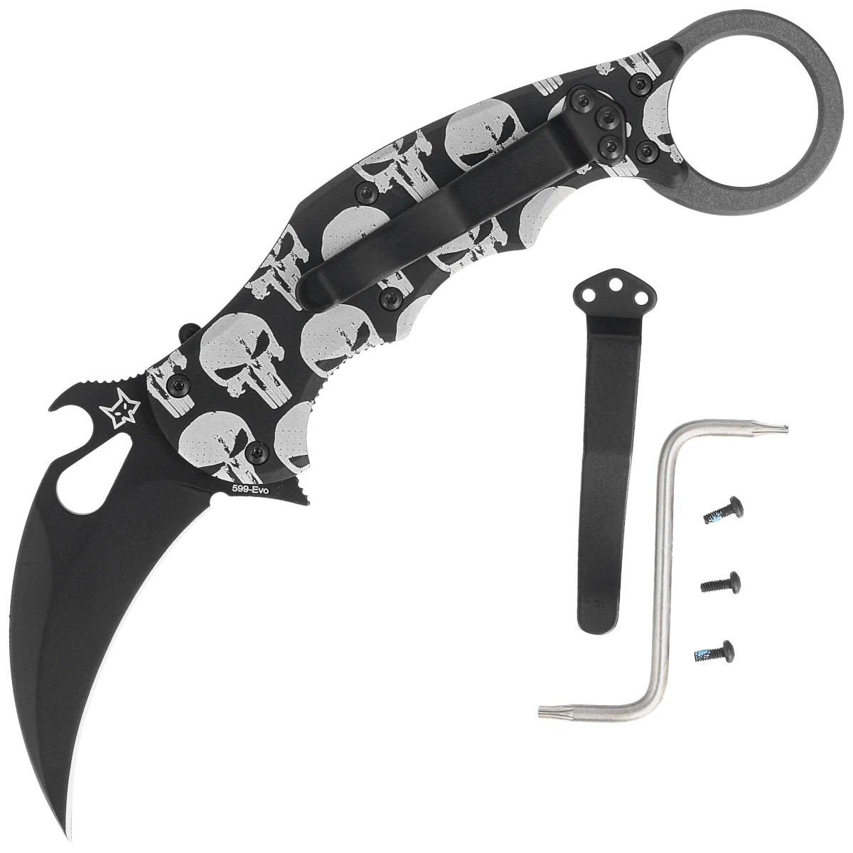 - The Skull Karambit Black Aluminum, Black Folding Karambit for everyday use and for duty. Black coated blade with hawk bill profile made of Bohler N690Co steel, comfortable aluminum handle. Three methods for quick opening of the blade and a proven lock!