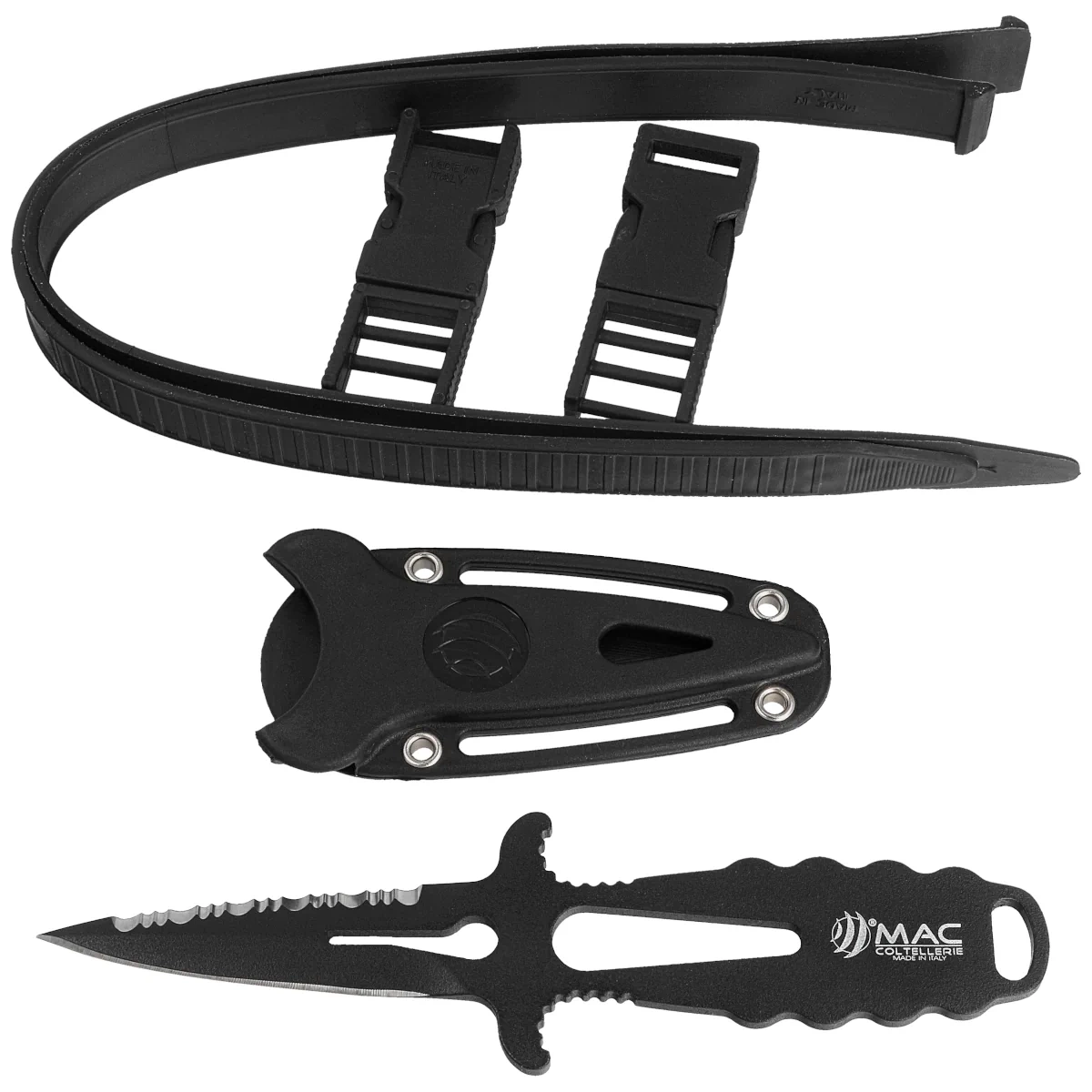 Sheath - made of hard PP polymer with holes for water and moisture drainage. The sheath is equipped with a latch to prevent the knife from slipping out in the water. Two rubber straps and 2 plastic buckles are included with the sheath to allow it to be attached to the shoulder, lower leg or vest.