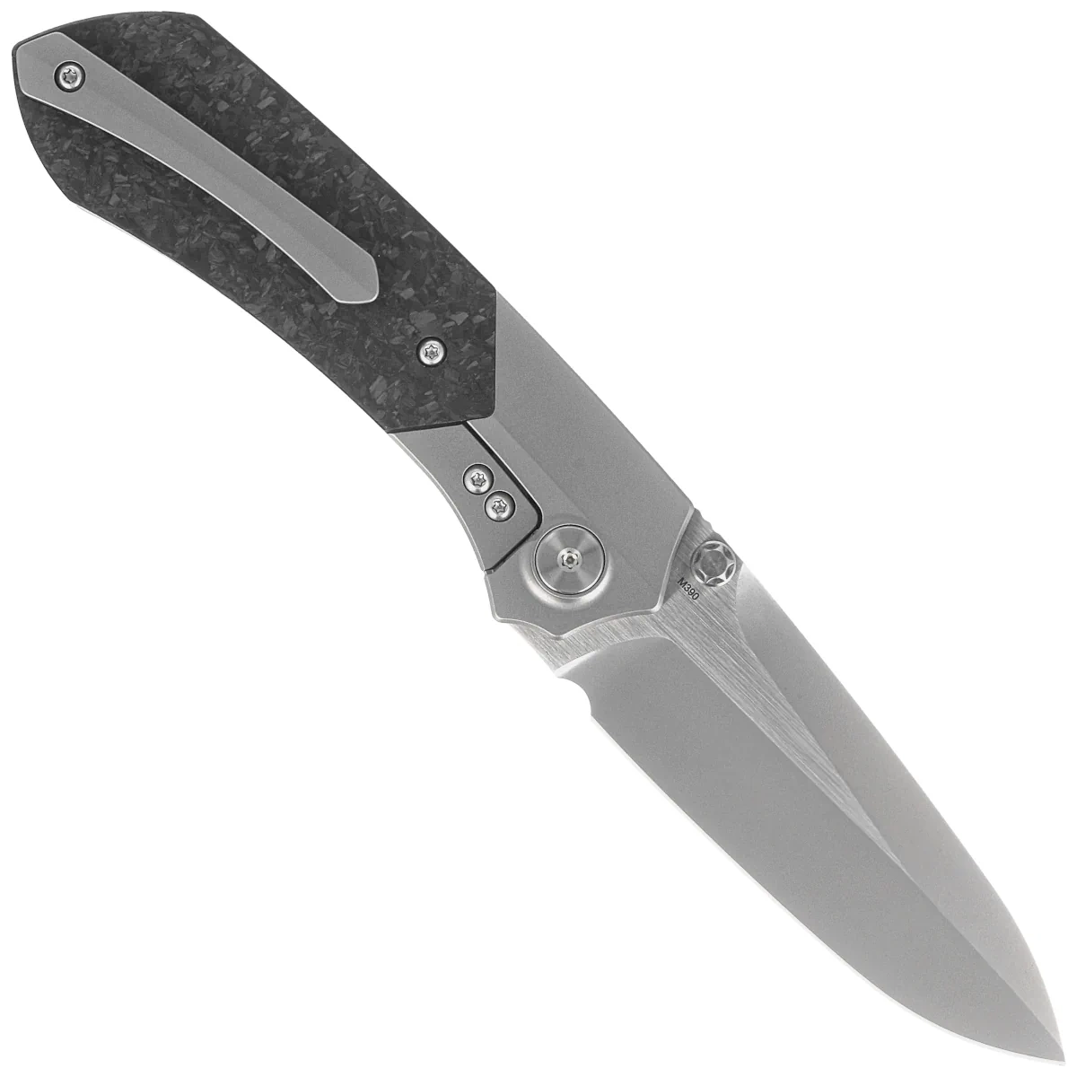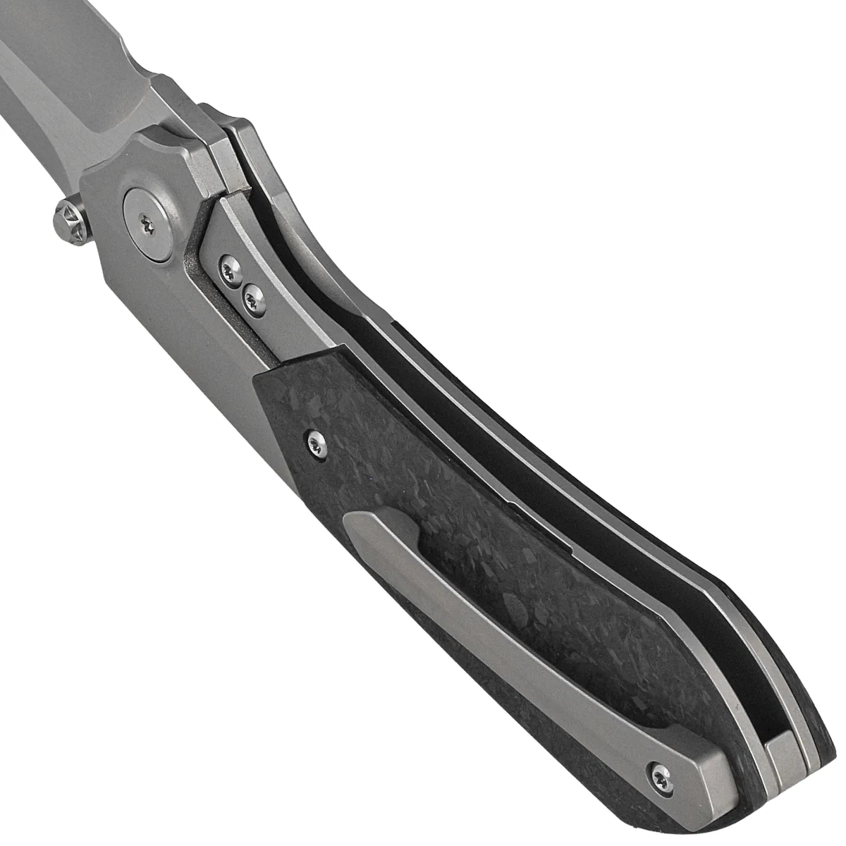Handle - 6AL4V titanium bolsters, Shredded Carbon Fiber composite handle made of virtually indestructible material, resistant to weather conditions, chemicals and mechanical damage. Beveled edges on the covers eliminate sharp edges. The grips are screwed to a solid titanium backspacer, ensuring that the desired stiffness of the entire structure is maintained. On the left side, there is a wide Button Lock, recessed to prevent accidental opening. The The single-position (right) titanium deep carry clip allows you to carry the knife discreetly in your pocket in a tip-up position (with the tip of the blade up).