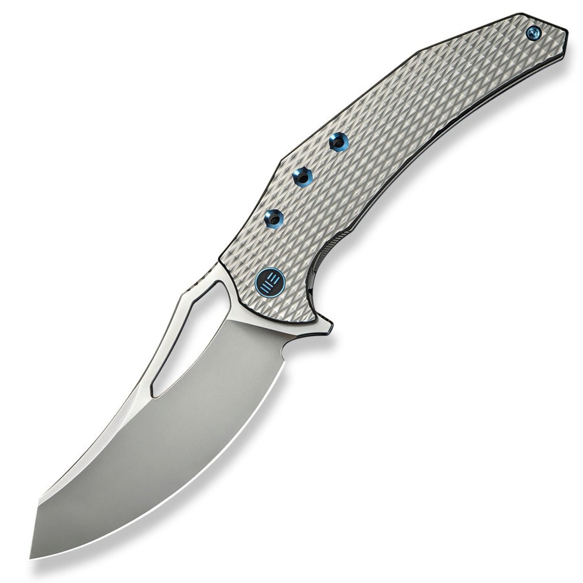 Handle - made of titanium 6AL4V, beveled edges of the covers eliminate sharp edges. Fully covered with a diamond-shaped texture for a more secure grip. The open-backed design, fixed with titanium spacer sleeves, reduces weight and facilitates cleaning. The pivot axle is decorated with a stylized WE Knife logo. A deep forefinger groove improves grip. A single-position (right) titanium deep carry clip allows you to carry the knife discreetly in your pocket in a tip-up position (with the tip of the blade up).