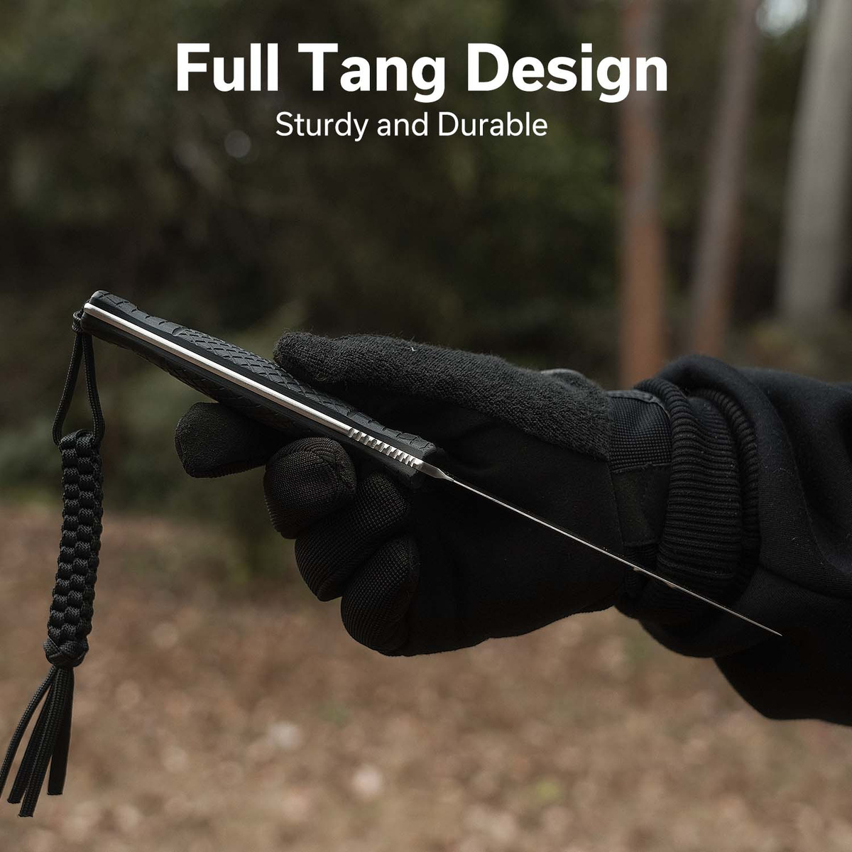Handle - grips made of roughened G10 composite, a weather-resistant, chemical-resistant and mechanically robust plastic, which are screwed directly onto the tang. The profiled shape and deep knurling ensure a comfortable, secure grip even with wet hands. Theforefinger groove improves grip and prevents the hand from slipping onto the blade. There is a hole for a decorative or safety cord (a braided paracord lanyard is included with the knife).