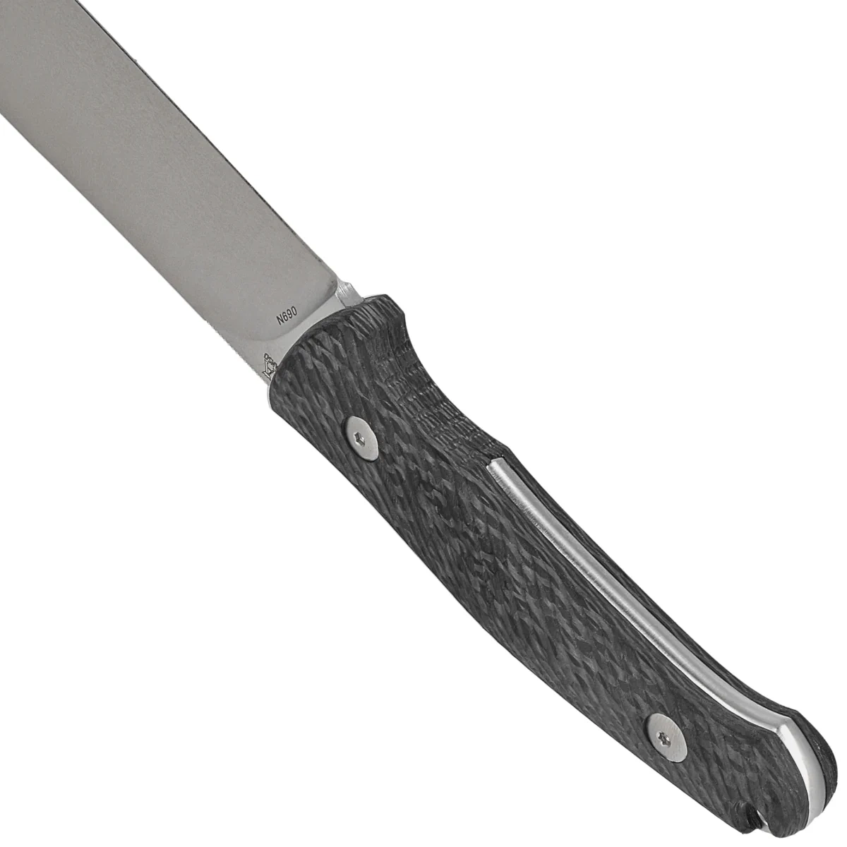 • Trail Black Carbon Fiber, Satin, large outdoor knife designed by Jens Ansø, a well-known Danish maker. Massive Böhler N690Co stainless steel blade, comfortable Carbon Fiber composite handle. Includes a classic leather sheath that attaches to a belt.