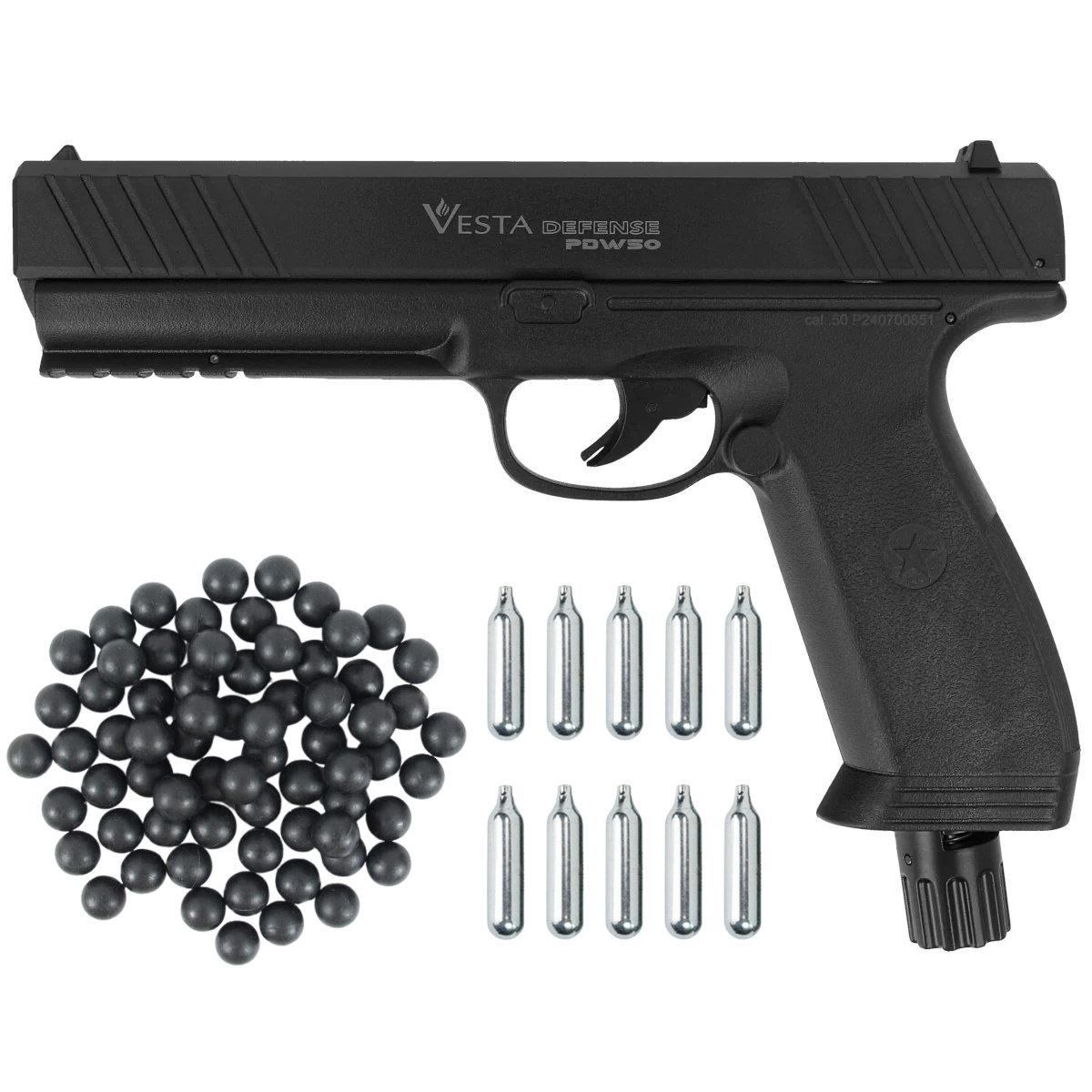 - Vesta PDW50 Set (.50 cal, 17 J) – a complete solution for defense, training, and recreation. Includes a CO₂-powered marker, 50 rubber balls, and 10 cartridges—delivering power, precision, and instant readiness.
