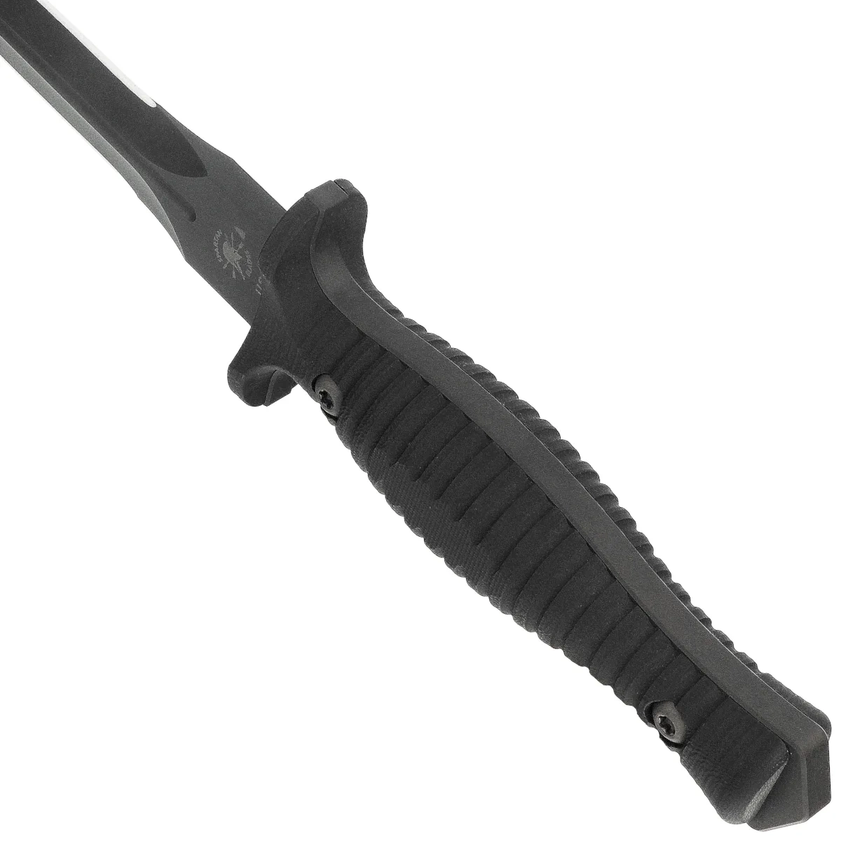 George V14 Dagger Black G10, Black PVD is a high-end tactical dagger designed by renowned knife maker Les George. The full tang construction is made of expertly-appreciated CPM MagnaCut steel, which ensures high corrosion resistance and reliable blade durability even in extreme conditions. The blade is coated with black PVD, which minimizes light reflection and effectively protects the surface from mechanical damage. The handle is made of durable, matte G10 composite and guarantees a secure grip with or without gloves. The special surface texture of the handle prevents the knife from accidentally slipping out during intensive use. The set includes a sturdy molded kydex sheath that allows the knife to be attached to tactical equipment in various positions. Thanks to the combination of advanced materials and professional design, this dagger is highly regarded by personal protection officers, uniformed services and enthusiasts of the highest quality tactical solutions.
