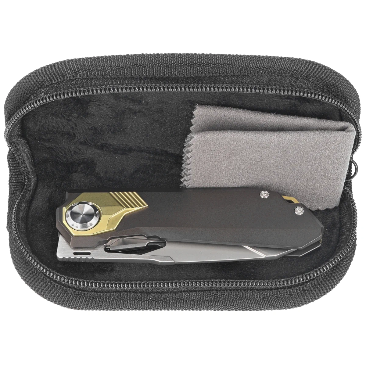Handle - thick pieces of sandblasted titanium 6AL4V, beautifully milled using CNC machine tools. The titanium backspacer to which the grips are attached guarantees the rigidity and strength of the entire structure. The simplicity and robustness of the construction ensure many years of use. The single position clip (right) made of titanium allows the knife to be carried in the tip-up position. The pivot axis with the Button Liner Lock is decorated with gold-colored titanium caps. On the right side, there is a slider for additional safety, which prevents accidental release of the blade. The protruding part of the backspacer has a place for threading a safety or decorative cord.
