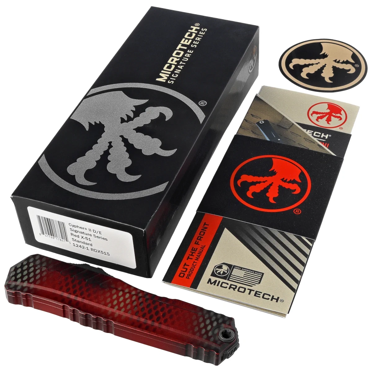 Microtech Cypher II D/E Signature OTF Knife Red X-51 Aluminum, Distressed Black M390MK by Deryk Munroe and Tony Marfione (1242-1RDX51S)