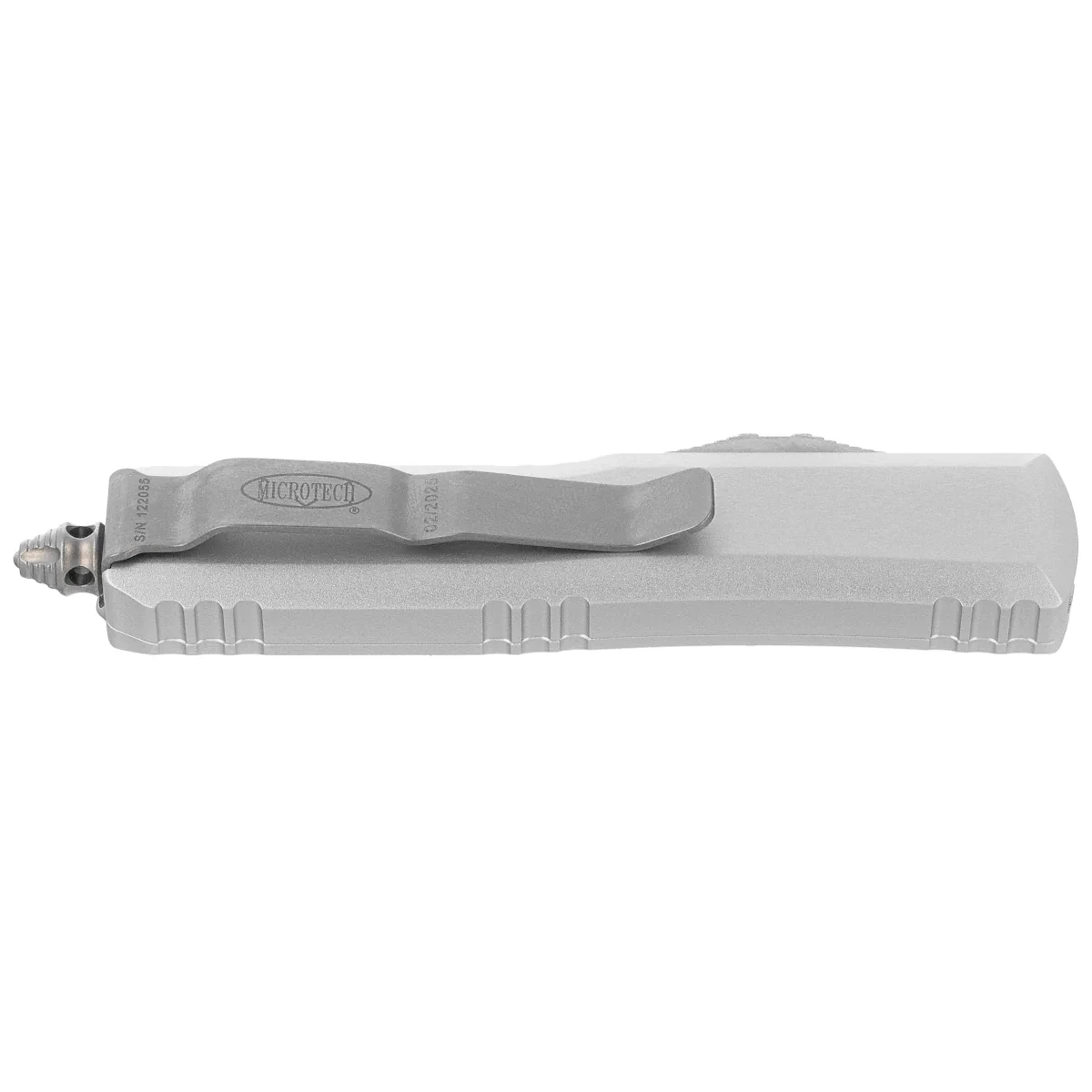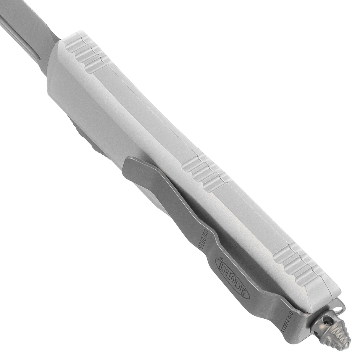 Handle - made with excellent precision in 3D technology on CNC milling machines, from brushed and polished 6061-T6 aluminum.... Handle surface texture makes the knife does not slip in the hand during use. There are notches (jimping) on the back and bottom of the handle for a more secure grip. The slim profile and milled two-position (right/left) solid deep-carry clip allow the knife to be carried discreetly in the pocket, in tip-down (blade tip down) position. The clip bears the Microtech logo, serial number and production date. The Handle is finished with a glass breaker, a solid steel triangle into which a tungsten carbide ball has been pressed. It also features a hole for interweaving a decorative cord.